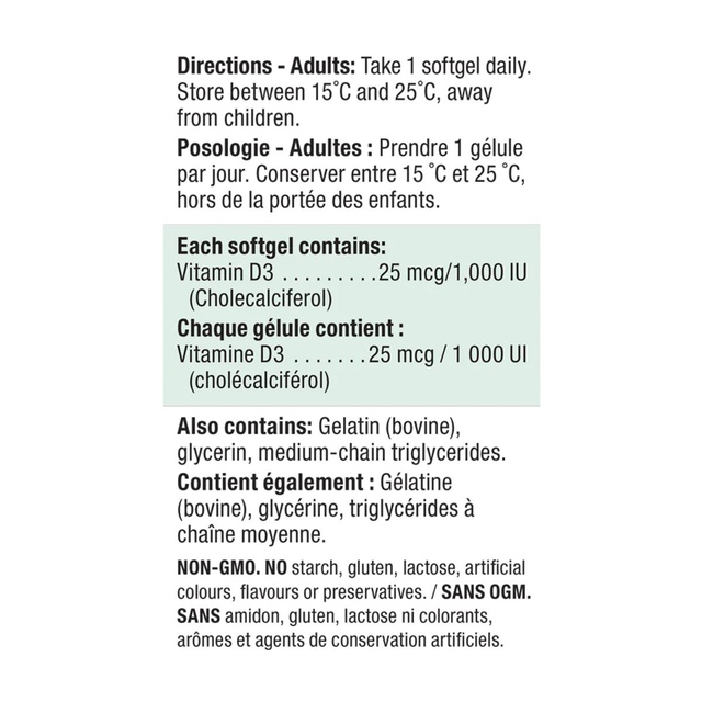 Jamieson Vitamin D3 1,000 IU can play a key role in the maintenance of good health while promoting the development of bones and teeth and helping the body effectively absorb calcium.
