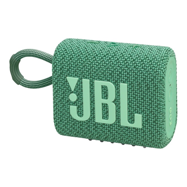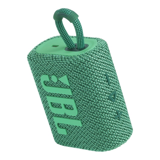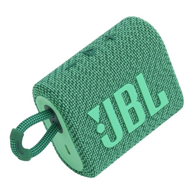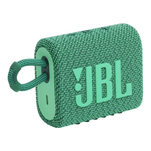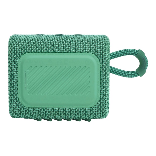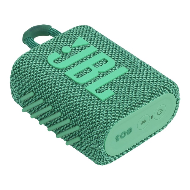 Now innovative and eco-friendly, make the world greener with the JBL Go 3 Eco Portable Speaker. It's designed from up to 90% post-consumer recycled plastic and wrapped in 100% recycled fabric on the speaker grille. The Go 3 Eco Bluetooth Speaker features an integrated loop, making it easy to take anywhere.