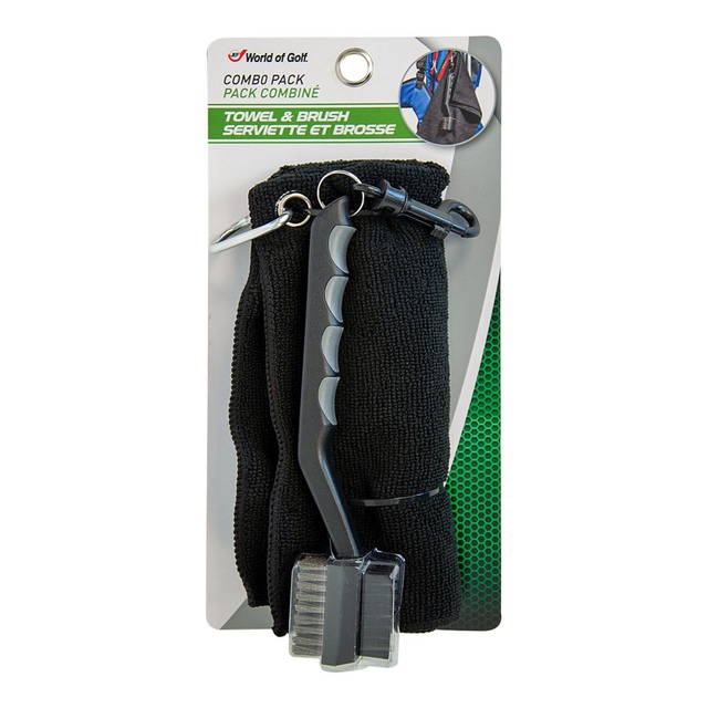 The Jef World of Golf Towel and Brush Combo contains both a convenient microfibre golf towel and a 2-sided golf brush. This duo is the perfect no nonsense golf gift for every golfer. Towel size at 15” x 15”, Towel is a handy, super-absorbent, plush microfibre towel with an easy-to-use carabiner clip. The 2-sided brush helps keep golf clubs clean for the next shot. Never miss another shot because you didn’t have a towel or brush to clean your hands, golf ball or clubs.