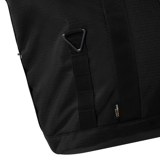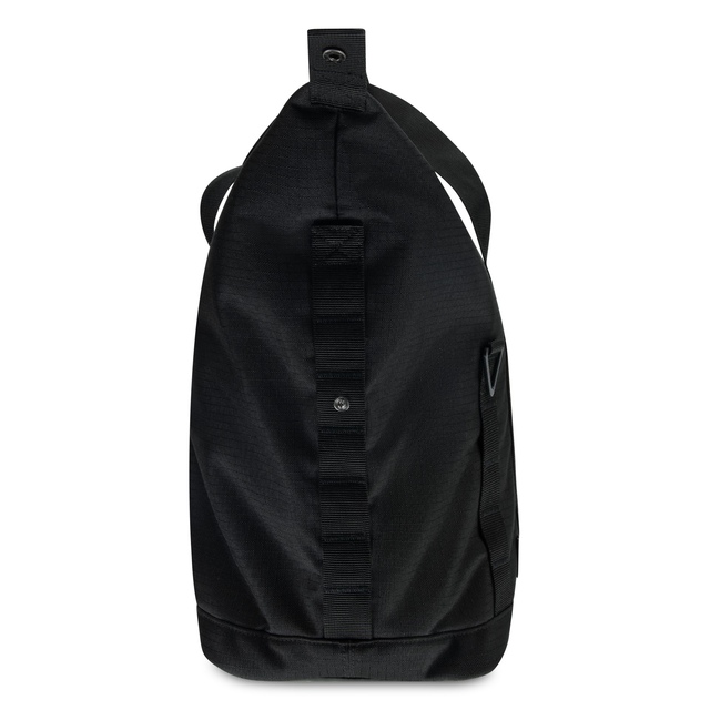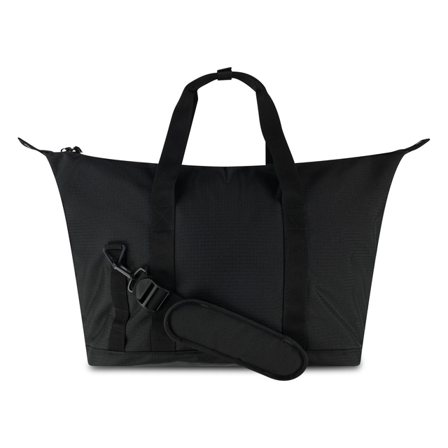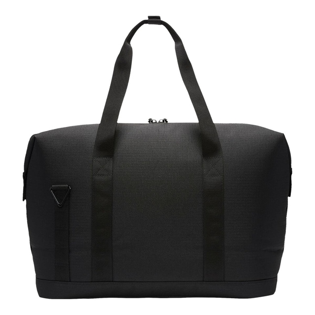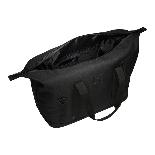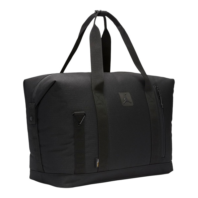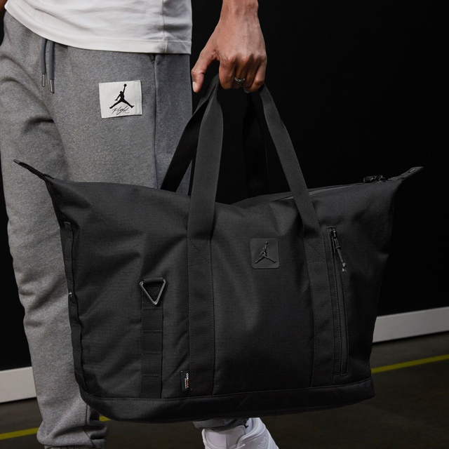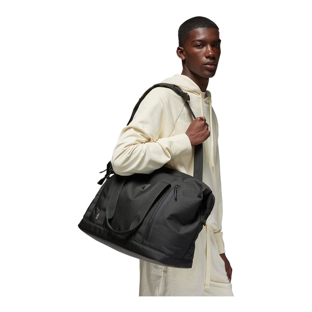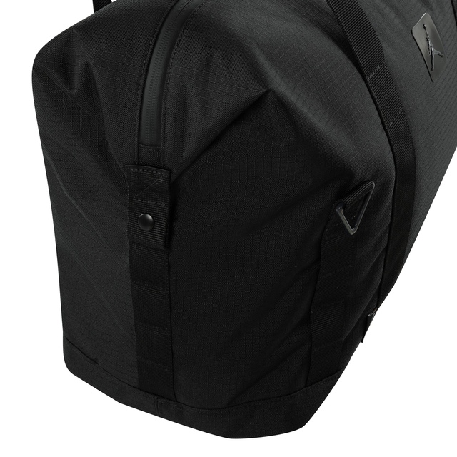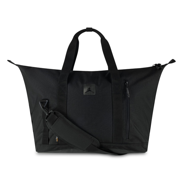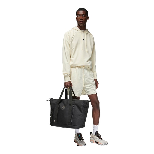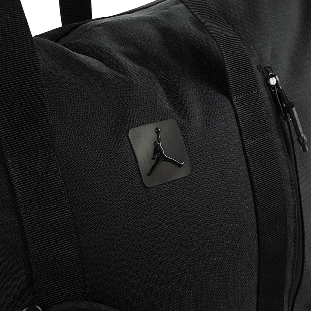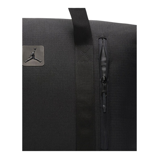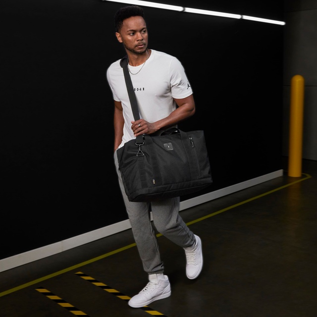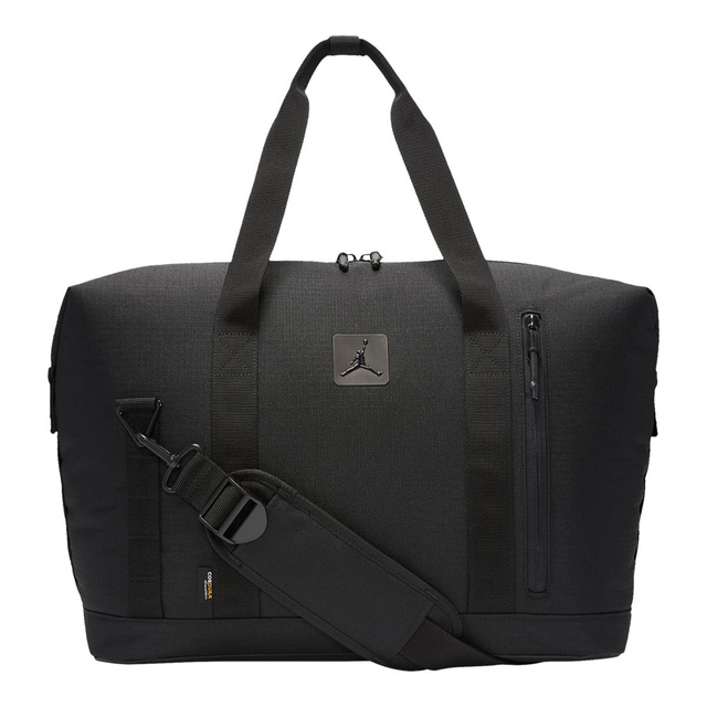 This Duffel Bag is made of a durable Cordura Ripstop fabric with a large main compartment with a 2-way zipper, 1 front zipper pocket and 1 internal diamond mesh pocket. Includes a padded removable shoulder strap and side snap buttons. Finished with a Jumpman logo. Size: 13" (H) X 21" (W) X 10" (D) Capacity: 35 (L)