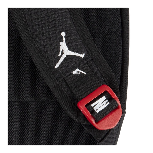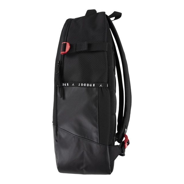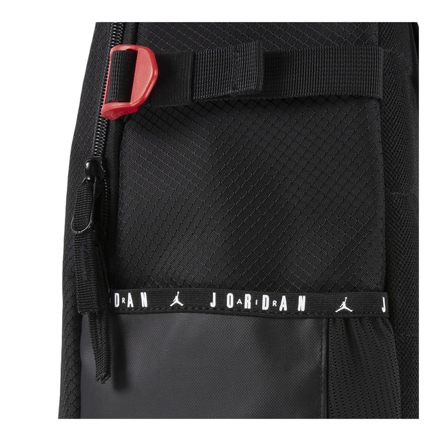 Super durable backpack with a front organizer pocket with zip closure, bottle pocket on each side, laptop sleeve and adjustable shoulder straps. Finished with a velcro patch at the front and a Jordan logo. Dimensions: 20.5"H x 13.25"W x 6.5"D