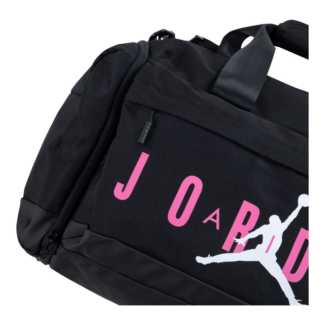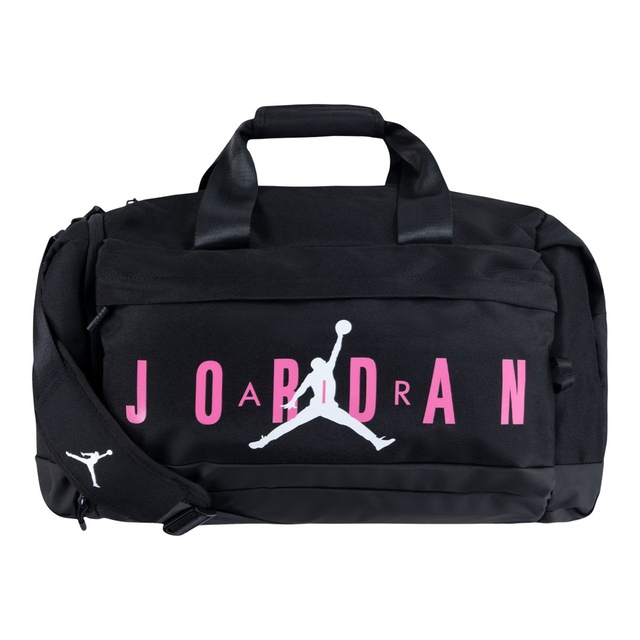 This spacious duffle bag features the Jordan logo on the large zippered front pocket. The large main compartment has a zip closure and houses a mesh drop pocket and media organizer to secure smaller items you don't want lost in the shuffle, there's a large slip pocket at the side and the shoe garage keeps the shoes you play in away from the clothing you want to keep clean. The grab handles have a hoook-and-loop closure to hold them together for easy carrying and the adjustable removable strap provides comfy wear.