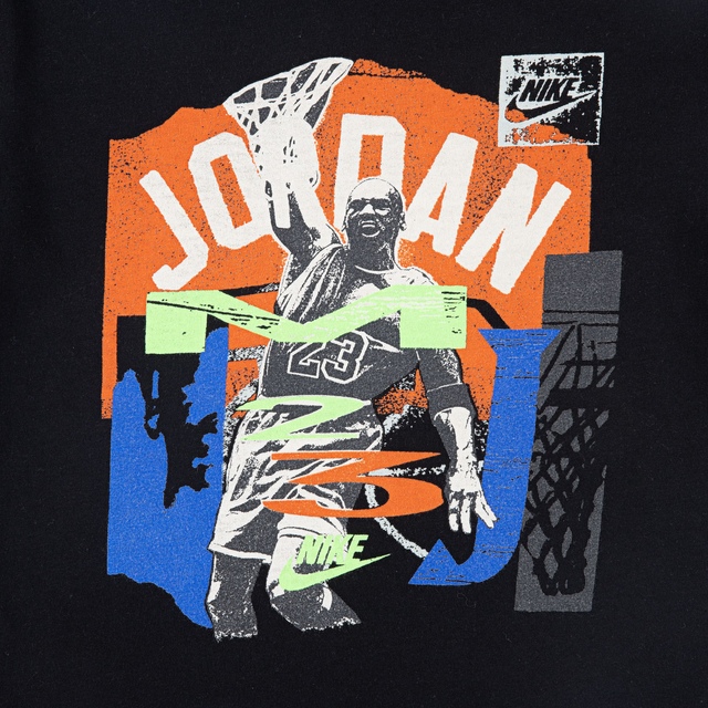 The Jordan Kids' Michael Throwback Slam Cotton T-shirt is a must-have for young fans. Featuring a retro graphic print, this shirt offers a smooth feel and a comfortable, tag-free crew neckline. Its classic fit ensures unrestricted movement, making it perfect for any activity.