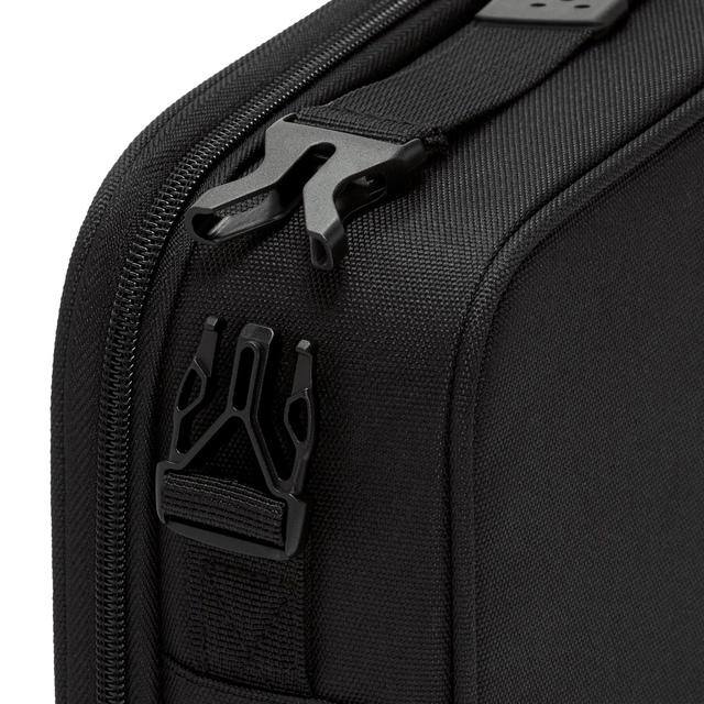 Top flat handle with buckle secures tote to your backpack for easy carrying