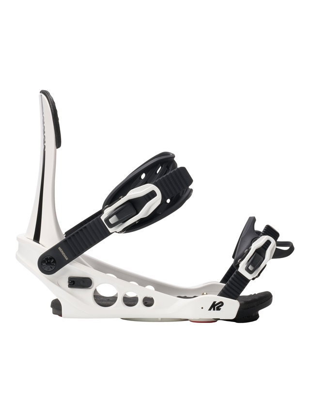 The K2 Meridian Women's Snowboard Bindings deliver all-day comfort, customization, and performance for the all-mountain rider. These freestyle-inspired bindings allow you to cruise, pop, and slash your way across the entire mountain with confidence. Featuring a supportive yet smooth flexing TriPod™ Chassis Women's Lockout Block chassis with interchangeable pods to customize lateral mobility and feel, the Meridians are highly versatile and built for female riders.