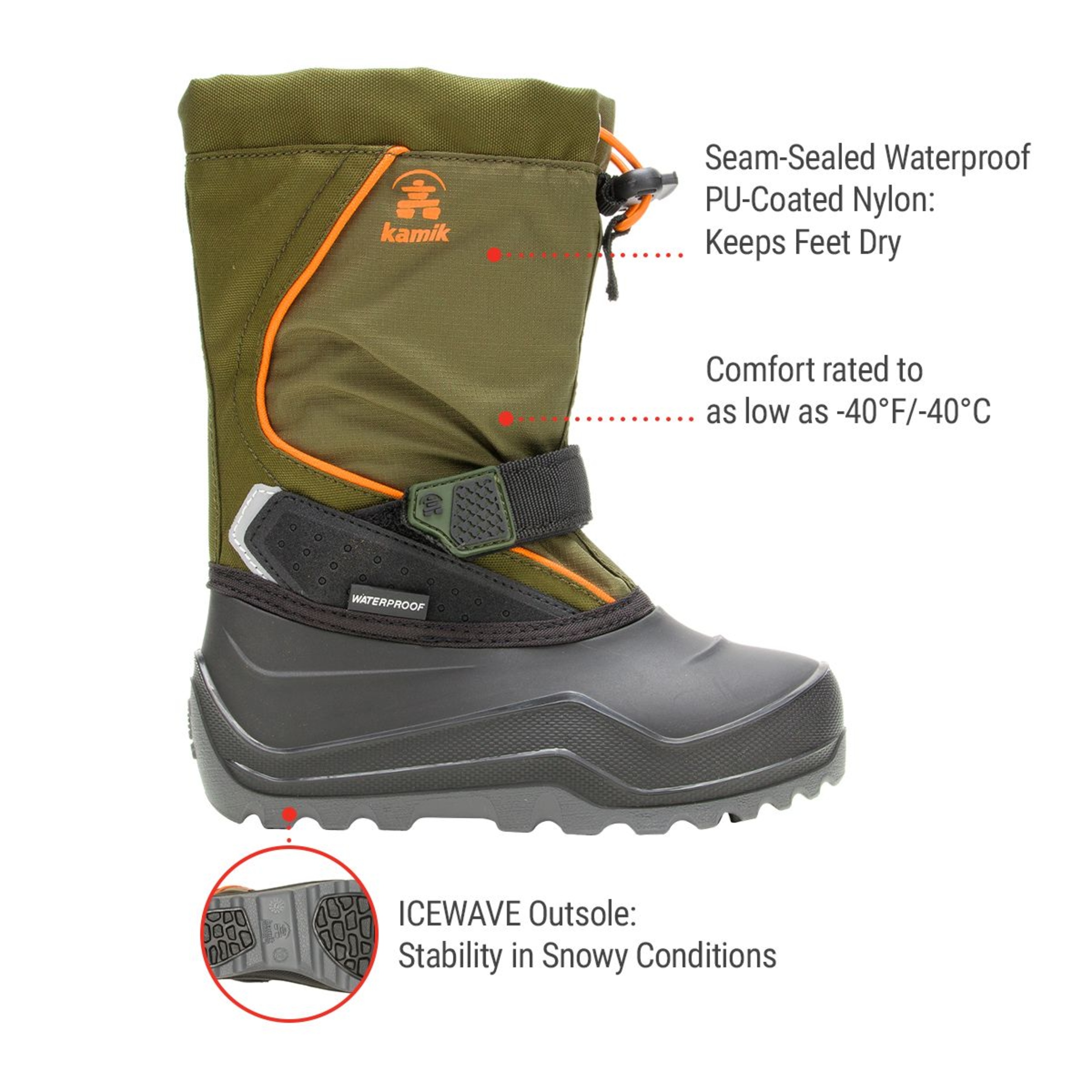 Featuring a seam-sealed waterproof construction and Zylex® removable liner, Kamik Kids' Snowfall 2 Waterproof Insulated Lightweight Winter Boots keep kids' feet dry and toasty down to -40°F. These insulated boots feature reflective NiteRays patches for more visibility during games of tag after dark. They have a removable frost plate insole, which adds an extra layer of insulation and comfort. Plus, these waterproof boots also feature an adjustable snow collar with Pull n' Lock technology for a secure fit while keeping snow out.