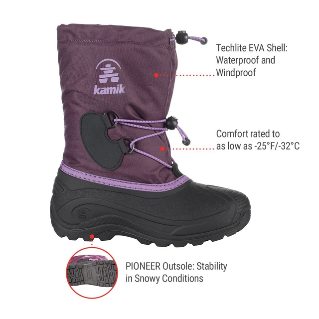 Designed for activities ranging from snowman-building to snowshoeing, the Kamik Kids’ Pre-School Southpole 4 Waterproof Non Slip Winter Boots offer exceptional protection and durability. These waterproof boots keep feet dry, while the adjustable snow collar enhances comfort. The Easy-Grab Lace Lock ensures a snug fit, and the PIONEER outsole features multi-directional treads for stability in snowy conditions.