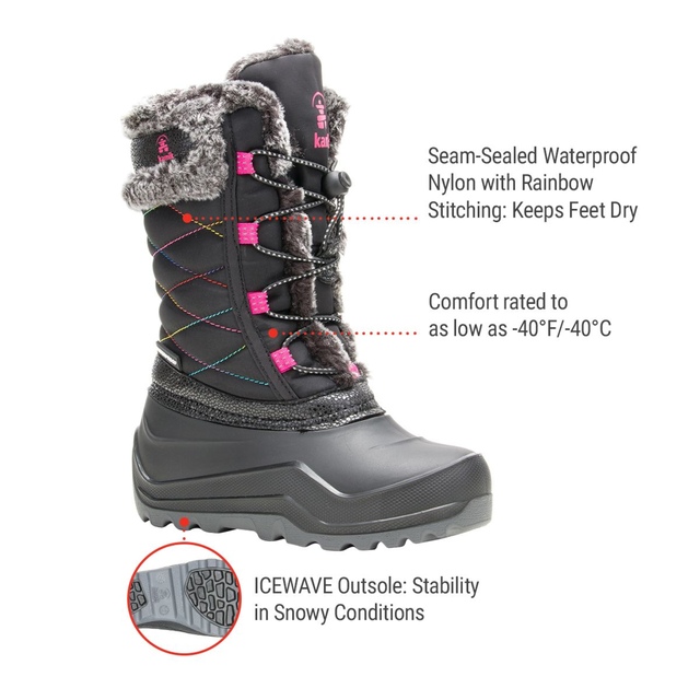 Lightweight and oh-so-cozy, the Kamik Kids' Star 4 Waterproof Insulated Fleece Winter Boots are made with seam-sealed waterproof construction and a moisture-wicking faux fur lining. These fleece-lined boots feature a removable 6mm felt/2mm EVA insole with silver foil lamination for added cold protection. Thanks to the NiteRays reflective technology, they are visible in low-light conditions for added safety. These waterproof boots also have a faux-fur snow collar for added warmth and are comfort-rated down to -40°C.