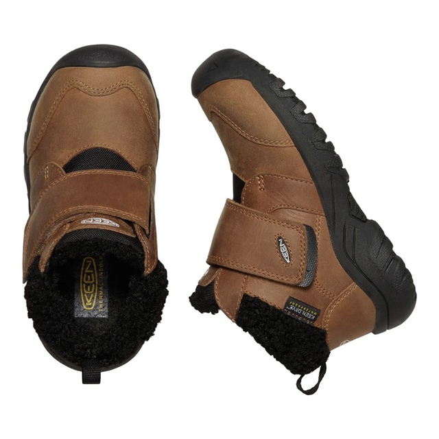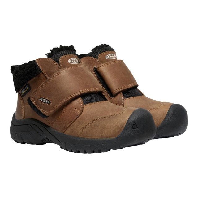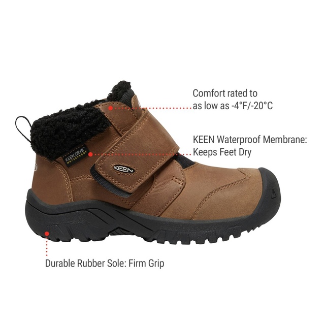 Staying active this cold season has never been this easy with the KEEN Kids' Kootenay IV Mid Waterproof Insulated Shearling Winter Boots. Featuring a slip-on design with an adjustable strap for a no-fuss fit, these waterproof boots have the iconic KEEN toe bumper to keep little feet protected. The high-traction rubber outsole leaves no trace or imprint while indoors and delivers all the grip they need. These fleece-lined boots are also perfect for rainy days on the playground and everyday adventures around town.