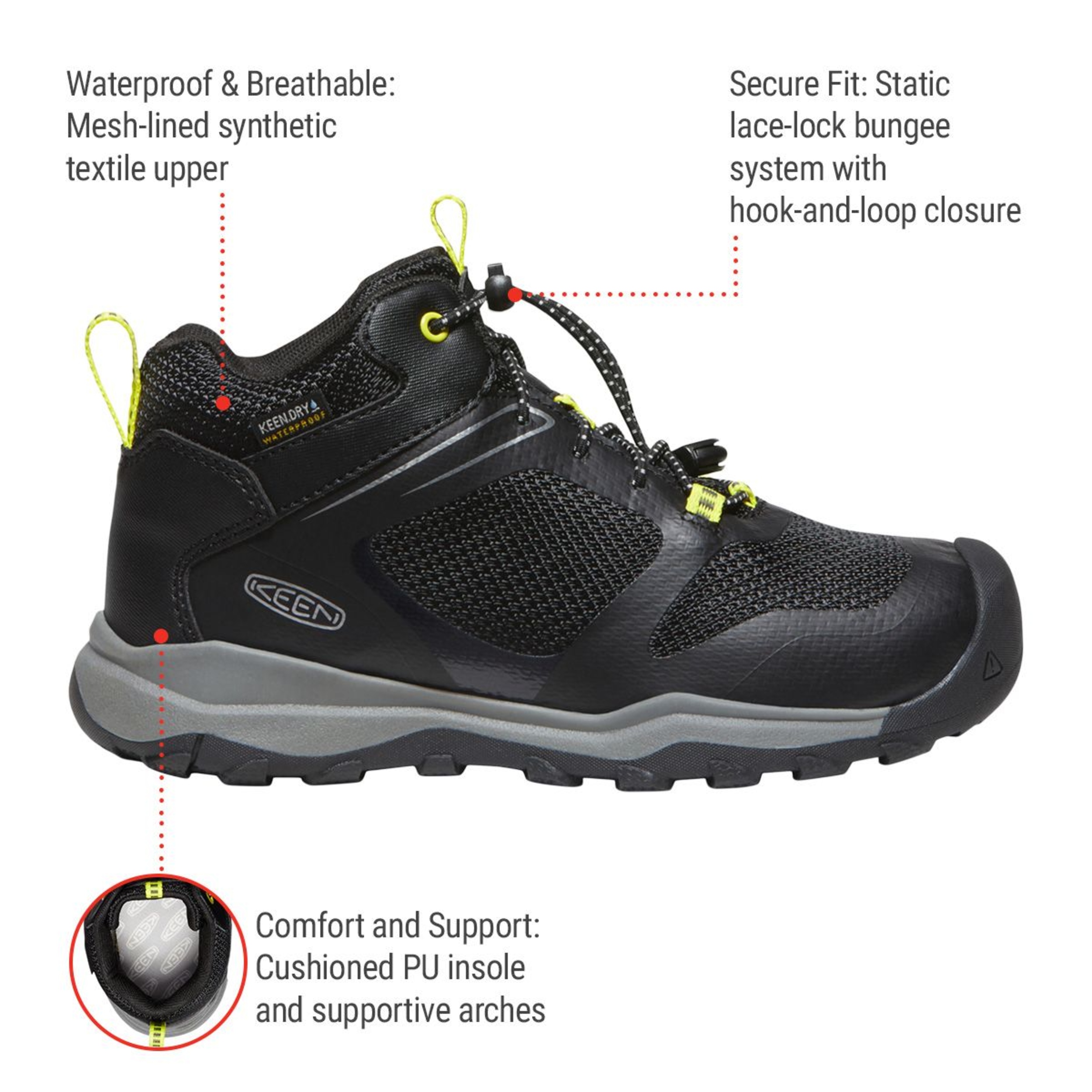 The KEEN Kids' Wanduro Waterproof Hiking Shoes are designed for youngsters who love the outdoors. Lightweight and athletic, these waterproof hiking shoes feature a durable synthetic and textile upper, breathable mesh lining and a cushioned PU insole for arch support. With KEEN.FUSION rubber and a secure bungee lace system, these shoes are built for adventure.