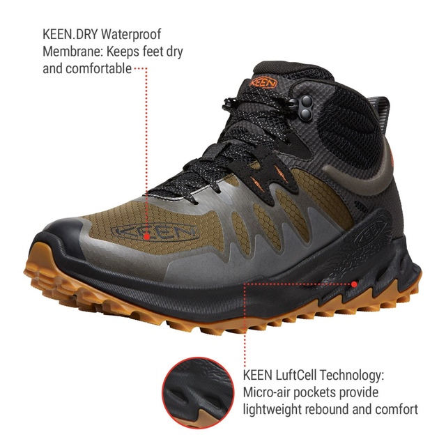 KEEN Men's Zionic Mid Hiking Shoes are made to deliver comfort in the great outdoors. Featuring a durable performance ripstop mesh material with KEEN.DRY waterproof membrane, they help your feet stay dry. A removable responsive footbed and KEEN LuftCell technology deliver underfoot comfort. These KEEN hiking shoes have a high-traction rubber sole with multi-direction lugs to enhance every step.