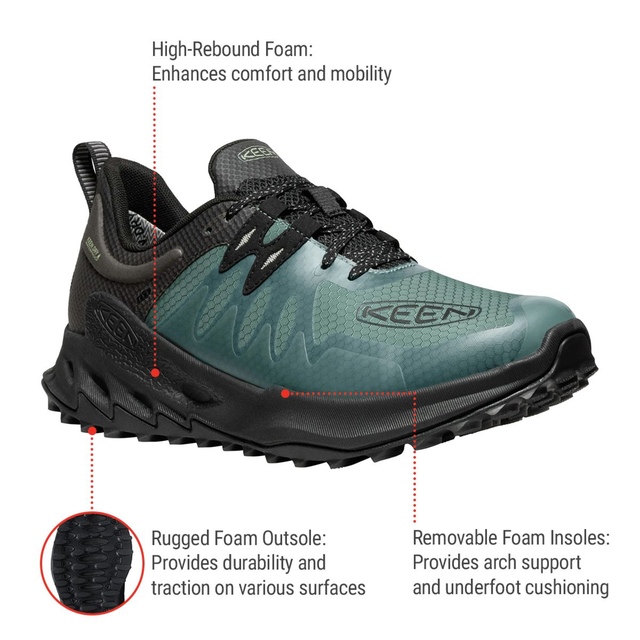 The KEEN Men’s Zionic Waterproof Hiking Shoes are designed to enhance your trail experience, allowing you to hike faster, farther and with more enjoyment. This unique blend of speed, stability and comfort propels you forward on your adventures. Removable foam insoles with arch support cushion every step, while high-rebound foam enhances overall comfort and mobility. Eco Anti-Odour technology keeps your feet fresh without pesticides. Rugged foam outsoles provide lightweight durability and excellent traction, making these hiking shoes perfect for any outdoor challenge.