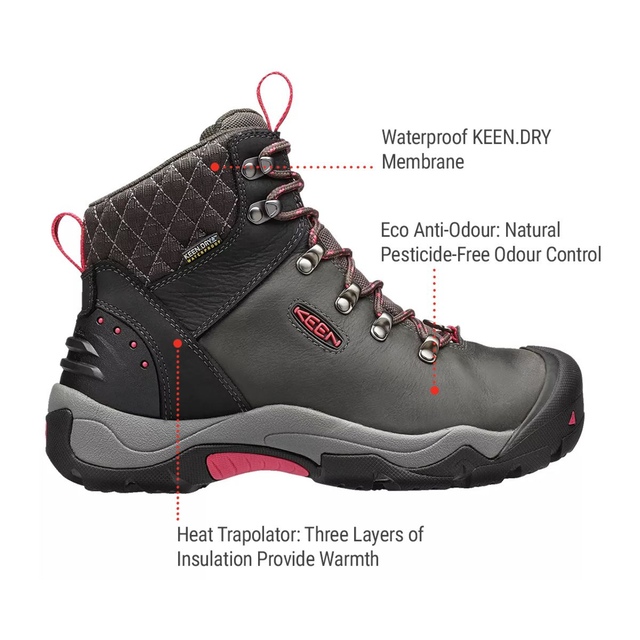 Explore the trails in comfort with these KEEN Women's Revel III Waterproof Insulated Non Slip Hiking Boots. Designed for icy conditions, these boots feature KEEN.WARM insulation, a KEEN.DRY waterproof membrane and a dual-compound rubber outsole for superior grip. Enjoy comfort with a compression-moulded EVA midsole and Eco Anti-Odour technology.