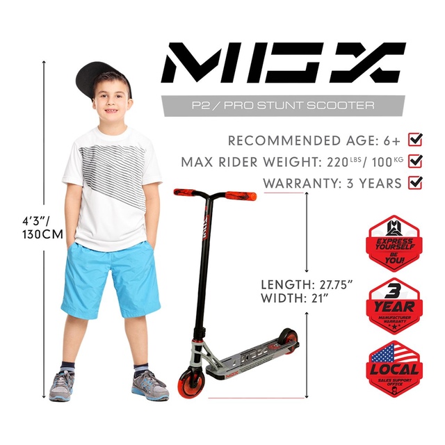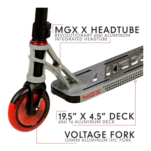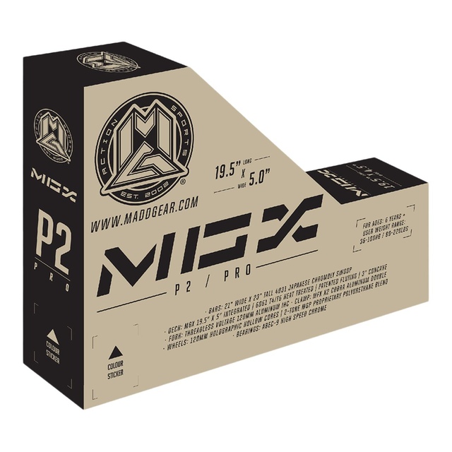 You may be interested in these similar products shown below.The MGX P2 sets the bar for what is possible in a ready to ride complete freestyle scooter with quality components from head to toe all built around the foundation of the bestselling and most successful pro scooter in the world! The hand selected components of the MGX P2 come together to produce an extremely well balanced complete that will have you dialing in your tricks faster and going bigger with more confidence – The MGX P2 will take anything you can throw at it and will keep coming back for more! Featuring the unmistakable MGX “X” Headtube Machine Welded to a Patented Internally Fluted Extruded Deck, Aluminum Threadless MFX Voltage Fork, 120mm Corrupt Hollow Cores Wrapped in MGP Two-Tone Proprietary Polyurethane Blend. The MGX P2 will take your progression to the next level! Complete Weight: 3.30 KG / 7.27 LBS | Deck Weight: 1.15 KG / 2.53 LBS.