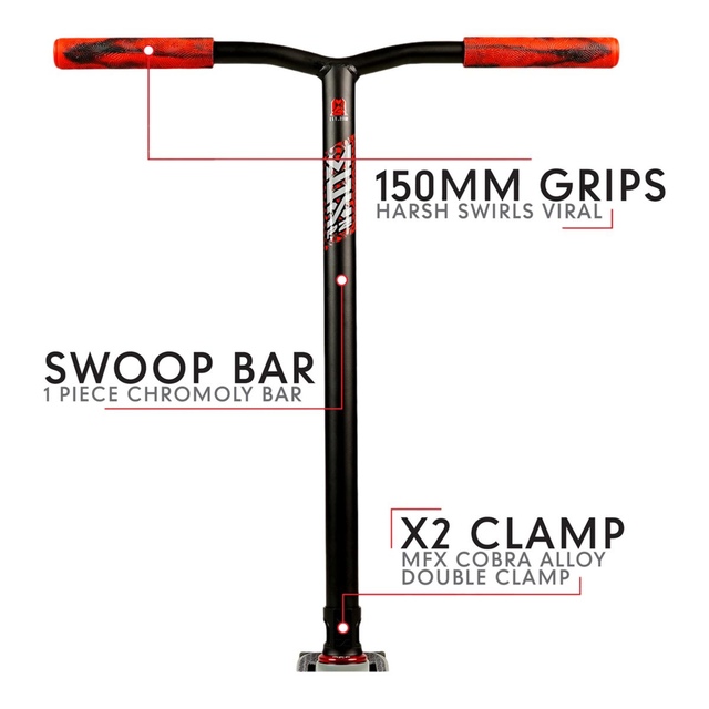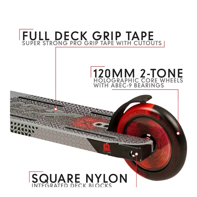 Brake: mfx v3 composite blitz. Hardware: high-tensile 6mm. Durable powder coating with mgx full deck wrap water decal.