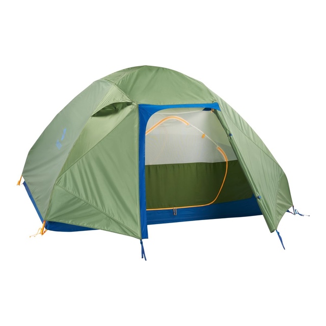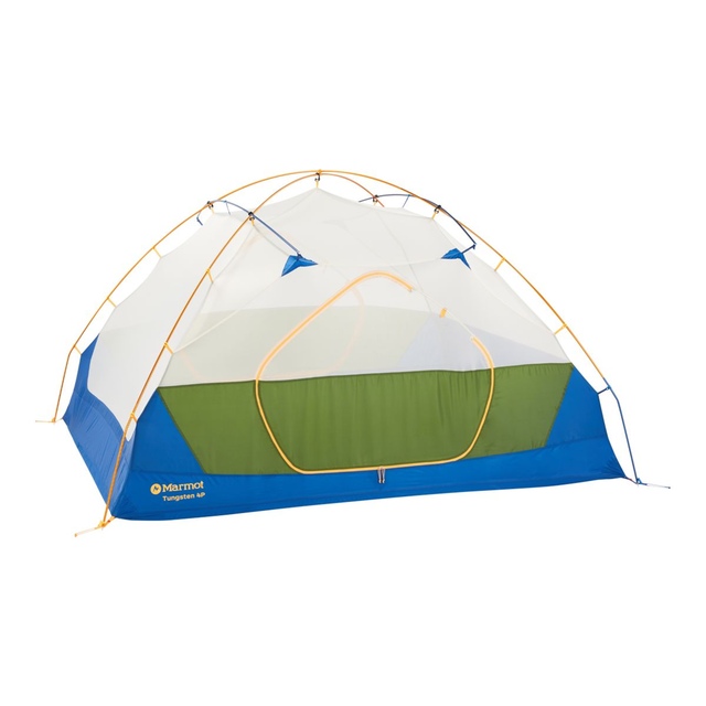 The Marmot Tungsten 4-Person Tent features a free-standing design with dual D-shaped doors and vestibules, offering convenient access and ample gear storage. Its full-coverage, seam-taped fly ensures rain protection, while the colour-coded "easy pitch" system facilitates quick setup. This handy Marmot tent includes a lampshade pocket, interior organization pockets and a protective footprint for hassle-free use.