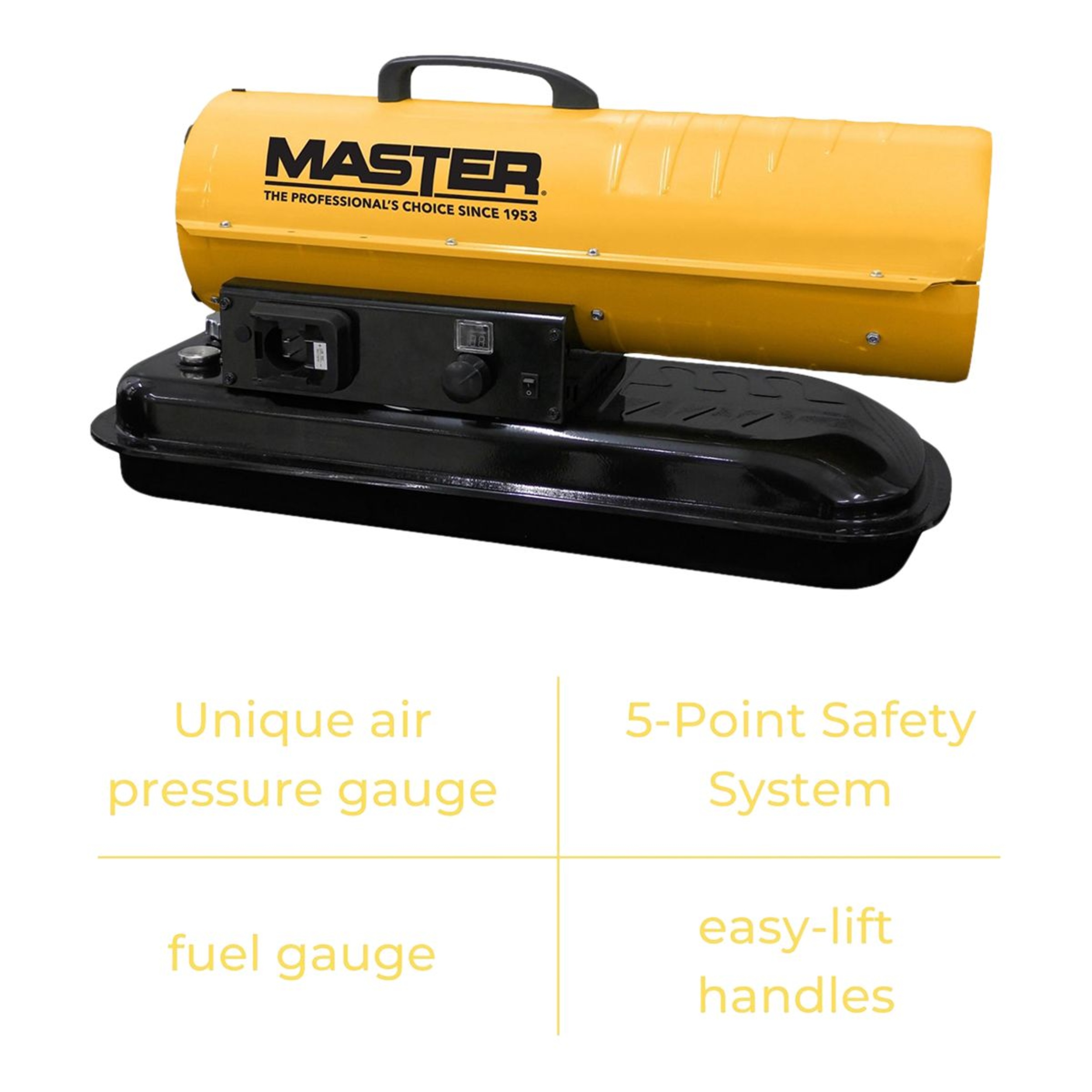 Unique air pressure gauge, easy-lift handles, fuel gauge, and 5-Point Safety System