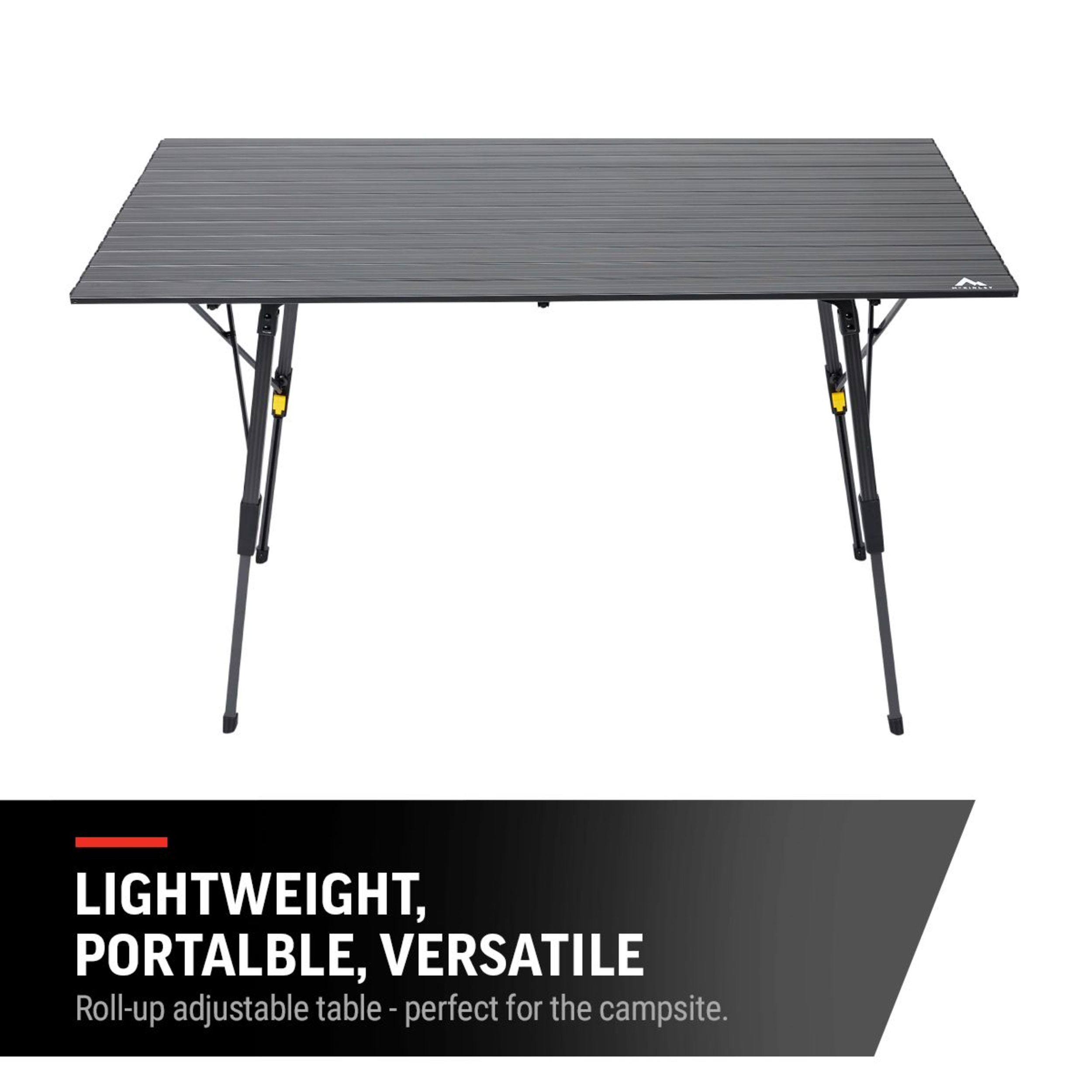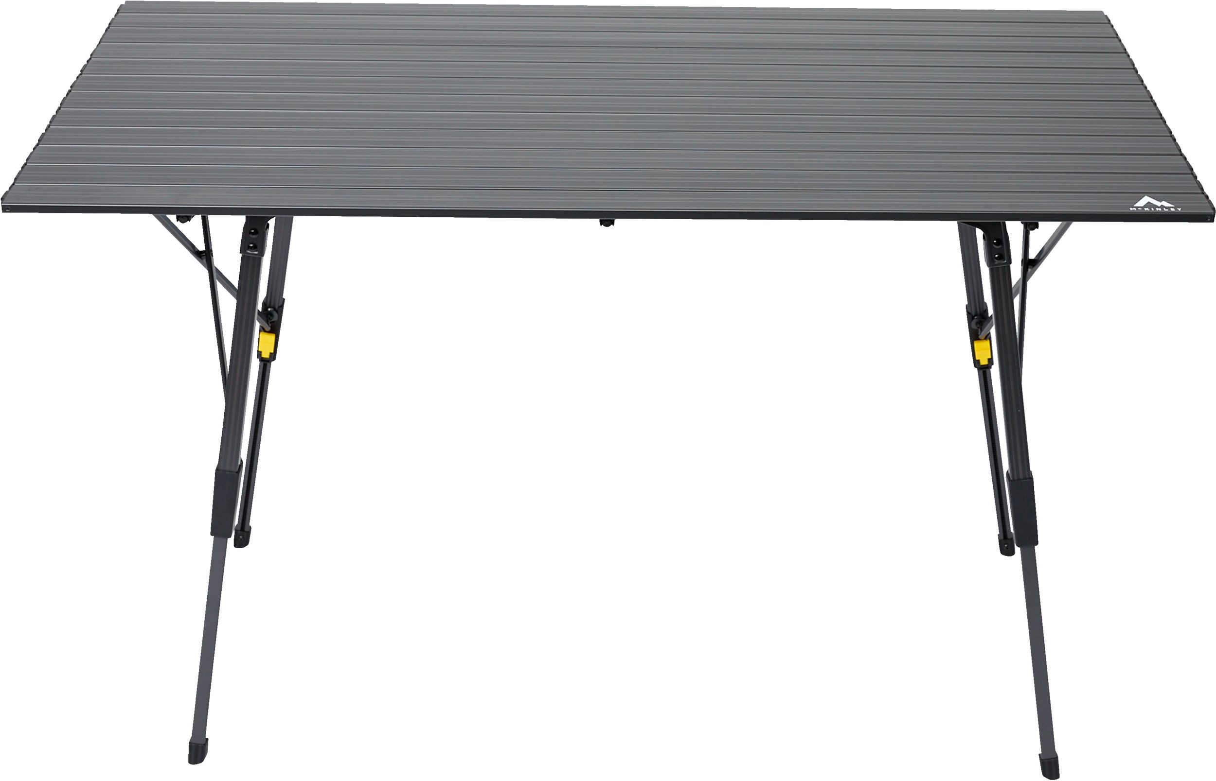 Elevate your outdoor set-up with the McKinley Adjustable Roll-Top Table. This lightweight, durable table features a powder-coated aluminum tabletop and adjustable aluminum legs for customizable height. This handy McKinley table rolls neatly into a carrying bag, facilitating easy storage and transport for camping, picnics and other outdoor events.