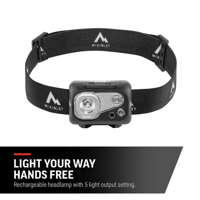 The McKinley Rechargeable Headlamp is an essential accessory for your outdoor adventures. It features a 1200mAh lithium-ion battery and dual LED lights with five brightness settings that can be adjusted manually or via motion sensor. This McKinley headlamp has a 75° pivotable light and an adjustable woven headband with a handy integrated hook.