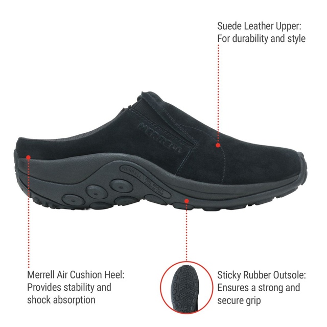 Merrell Men's Jungle Slides offer effortless comfort and shock resistance. They feature a pigskin leather upper and breathable mesh lining with a Merrell air cushion to protect the heel. The sticky rubber outsole provides superior traction.