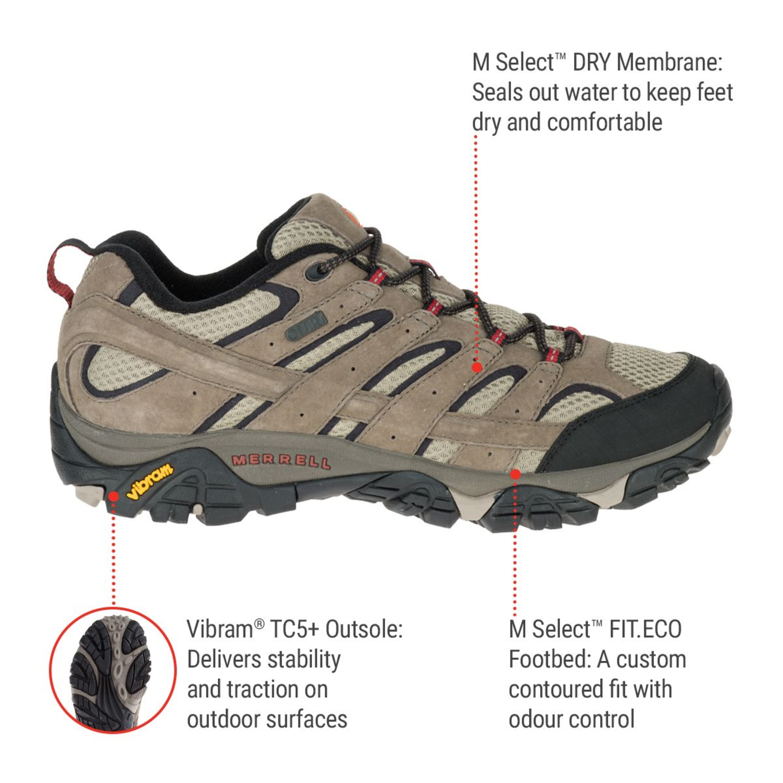 The Merrell Men's Moab 2 Hiking Shoes are made for the toughest terrains. This waterproof hiker features durable leathers, a supportive EVA contoured footbed, and a Vibram® TC5+ outsole for exceptional traction. The M Select™ DRY membrane of the Merrell men's hiking shoes keeps feet dry, while organic odour control maintains freshness.