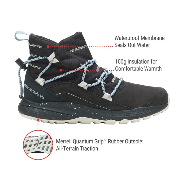The Merrell Women's Bravada 2 Winter Boots blend trail-ready features with a sneaker-like fit. These boots offer 100g insulation and a fleece lining for cold-weather comfort. With a waterproof membrane, these Merrell Bravada 2 boots will keep your feet dry in wet and snowy conditions.