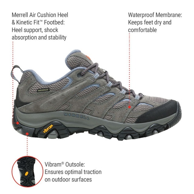 • Merrell Air Cushion heel absorbs shock, adds stability, and reduces fatigue on long hikes
