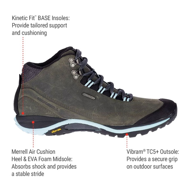 The waterproof and breathable Merrell Women's Siren Traveller 3 Hiking Boots are made of full-grain leather with Vibram® TC5+ rubber traction outsoles. Kinetic Fit™ BASE insoles coupled with EVA foam midsoles on these Merrell hiking boots provide tailored support and comfort on any terrain.