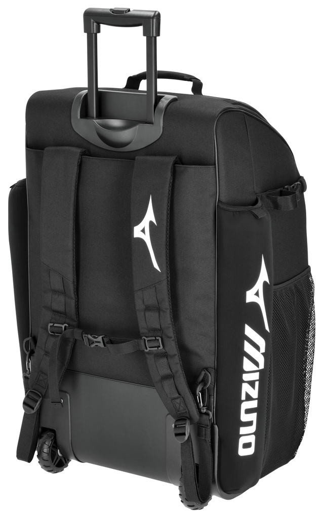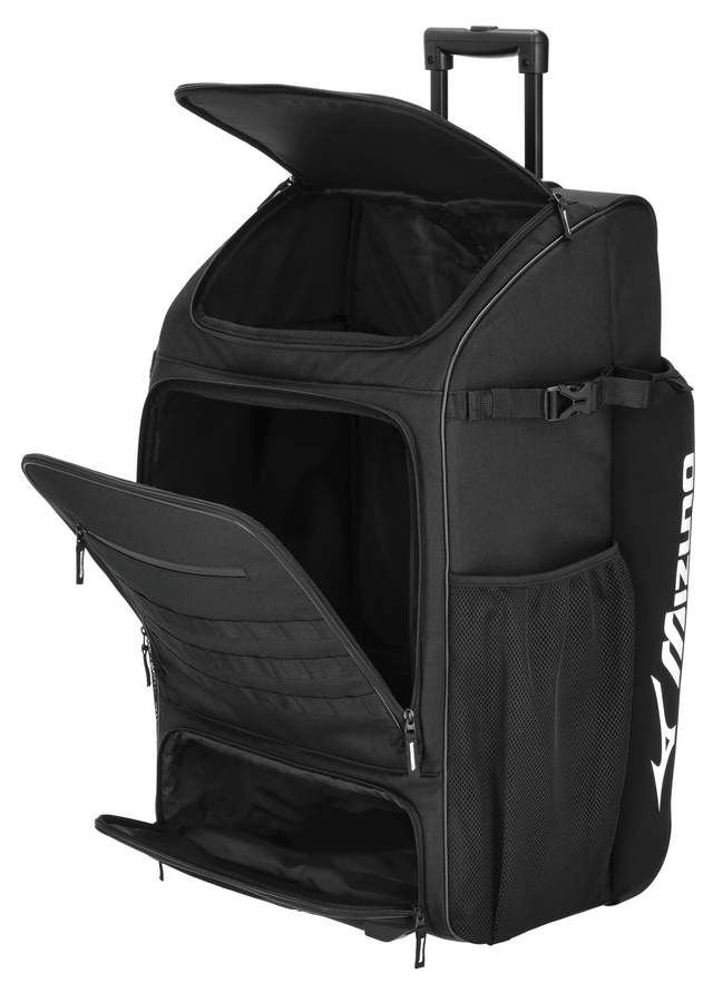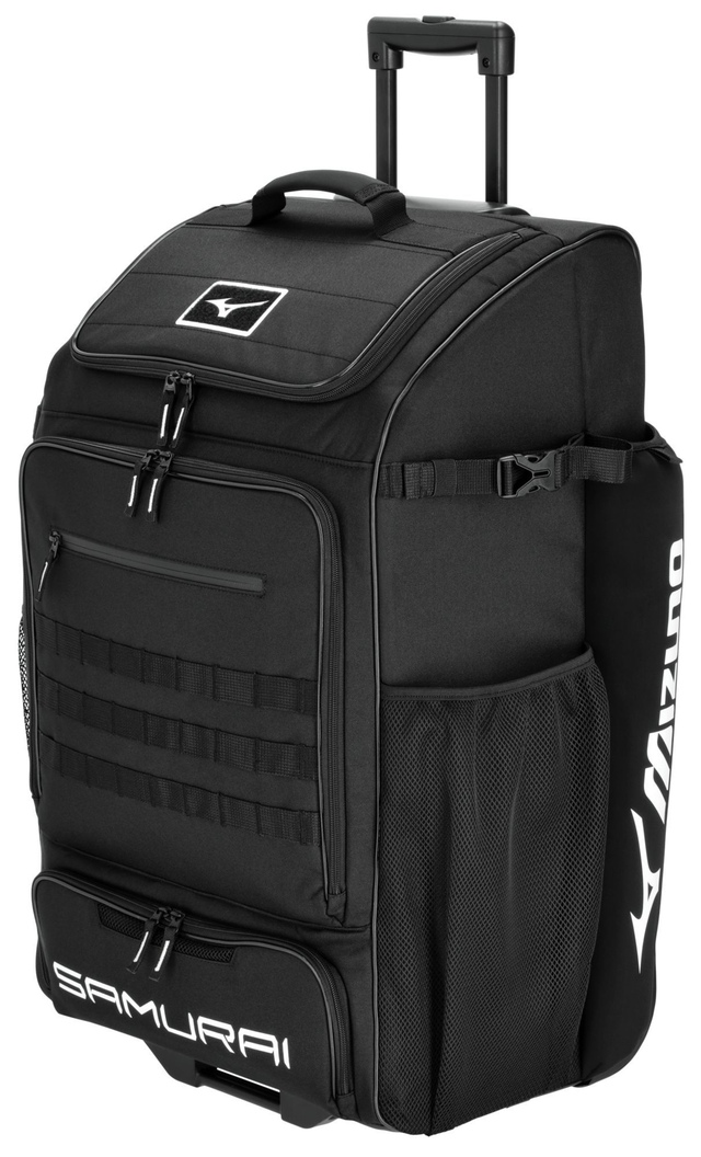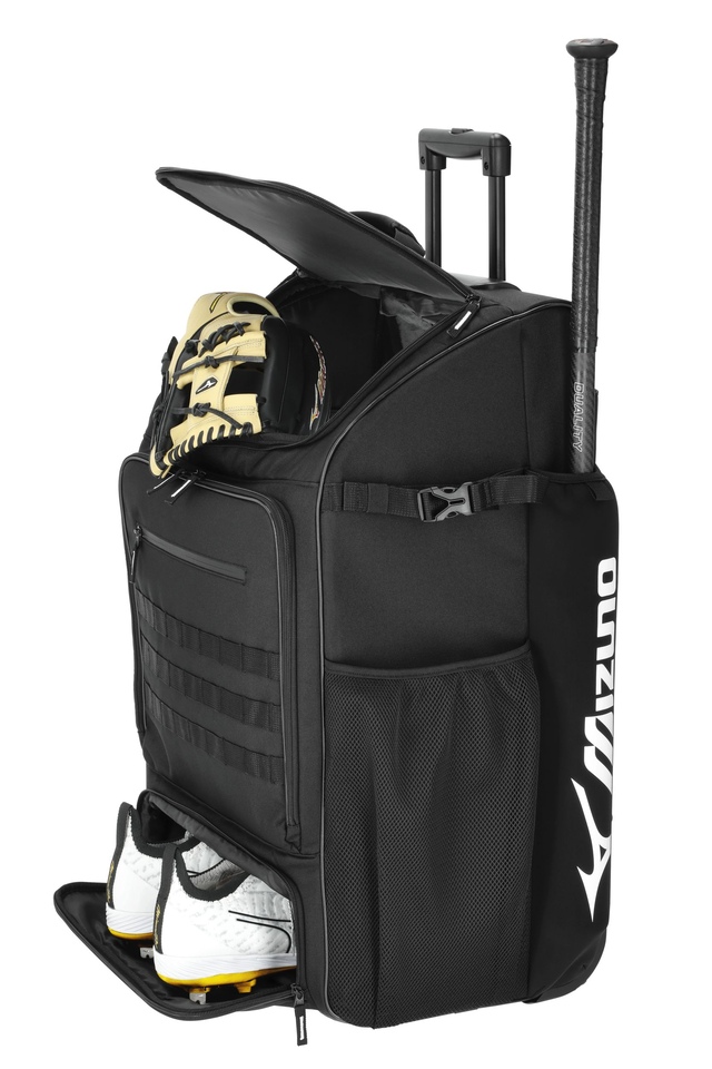 The NEW Samurai Select Wheel Batpack is a favorite among Mizuno Pros due to its fantastic features for gear storage and protection. It comes with a special compartment for your glove, ample space for all your gear, extra pockets on the sides, and a ventilated storage compartment for your cleats. You can easily hang it on a fence with the dual J hooks, and its sturdy wheels and running boards provide both stability and durability, meeting the needs of catchers.