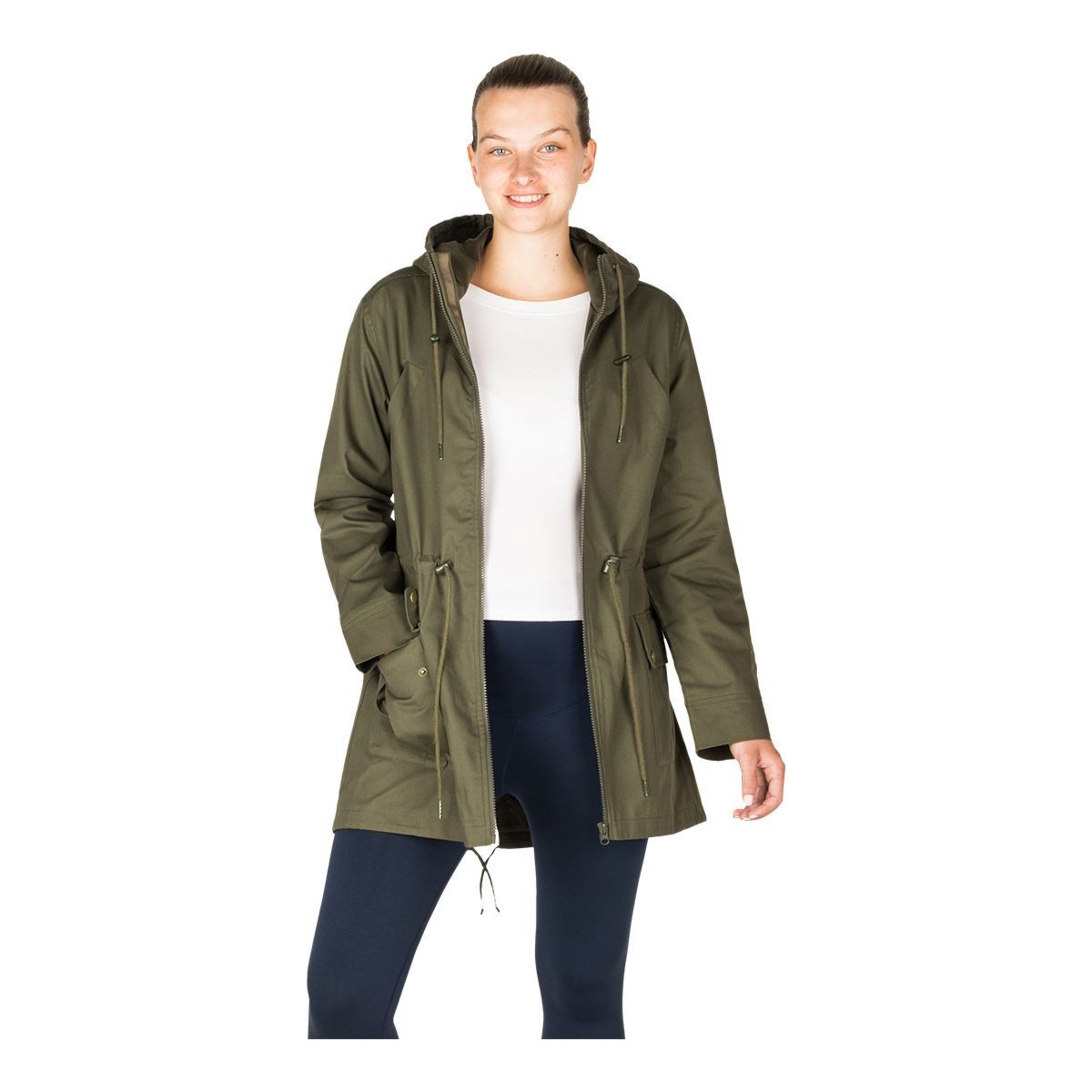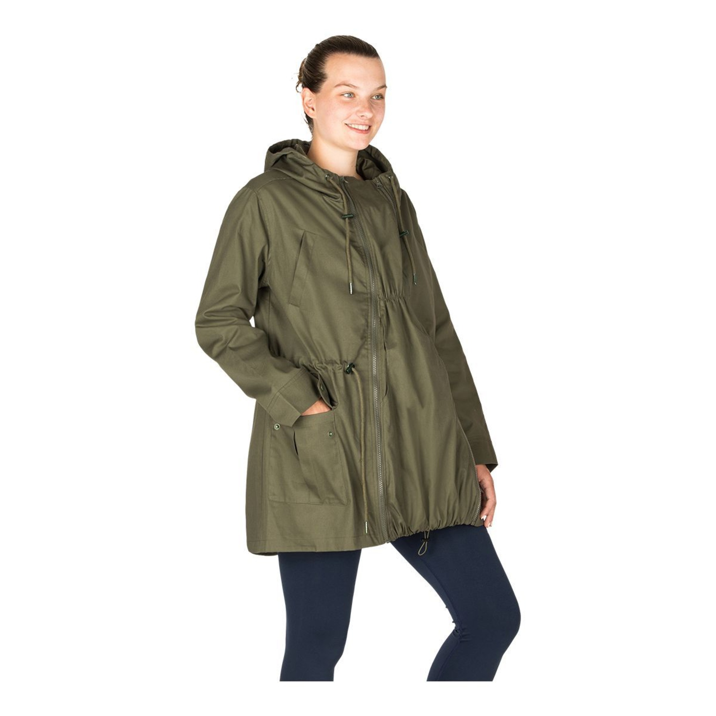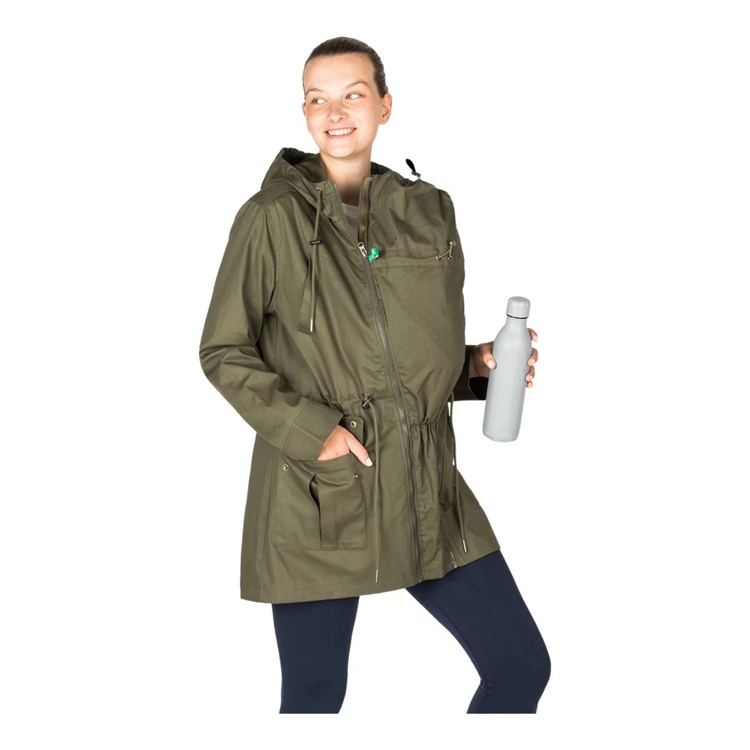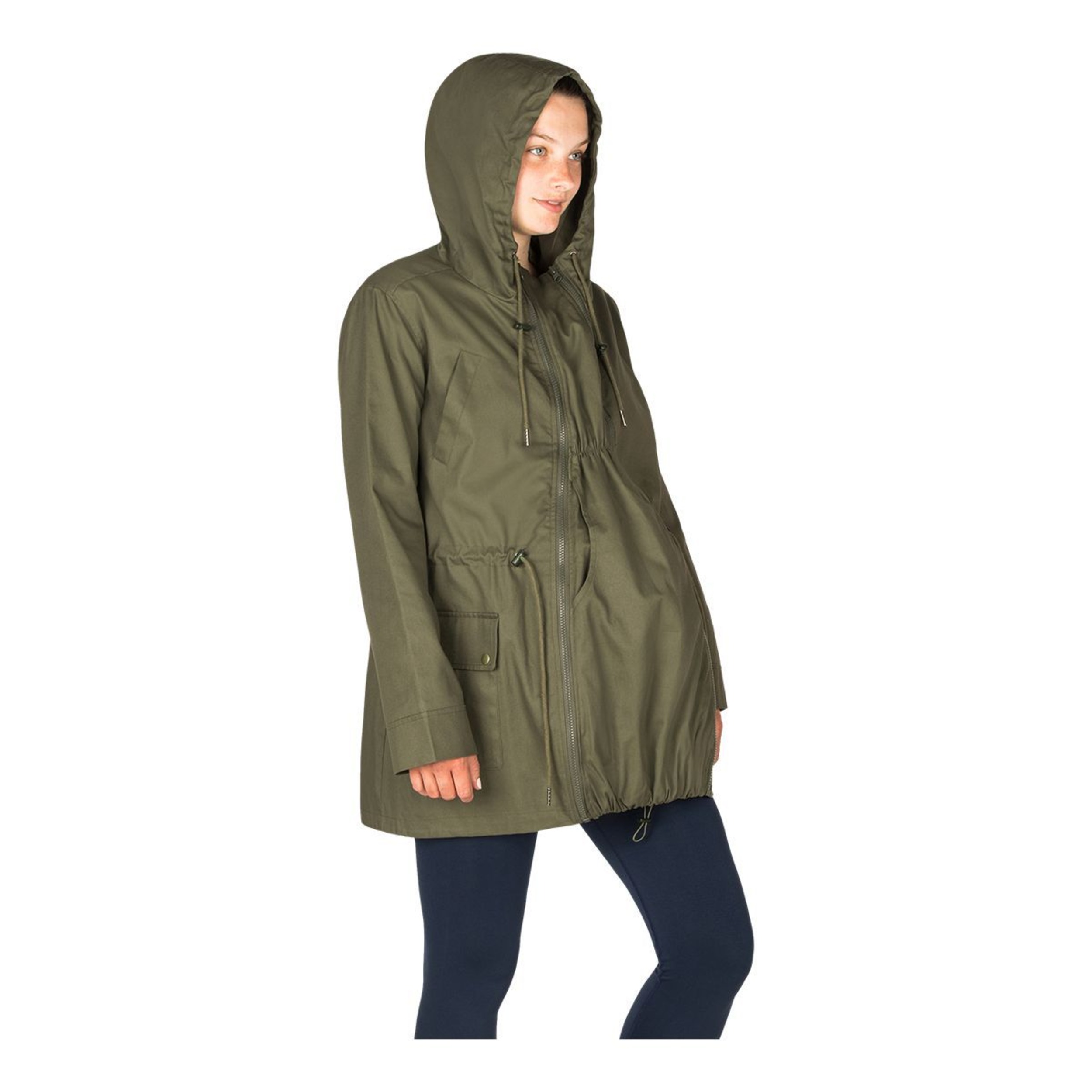 Mid-thigh length military style, the Modern Eternity Women's Lara Mid-Length Hooded Maternity Jacket offers a classic curve flattering fit to embrace your bump. Featuring 3-in-1 (Baby In, Baby Out & Baby Free) removable panel technology, this maternity jacket is suitable for wear before, during, and after pregnancy. The hooded jacket has kangaroo pockets, offering hands-free convenience and warmth.