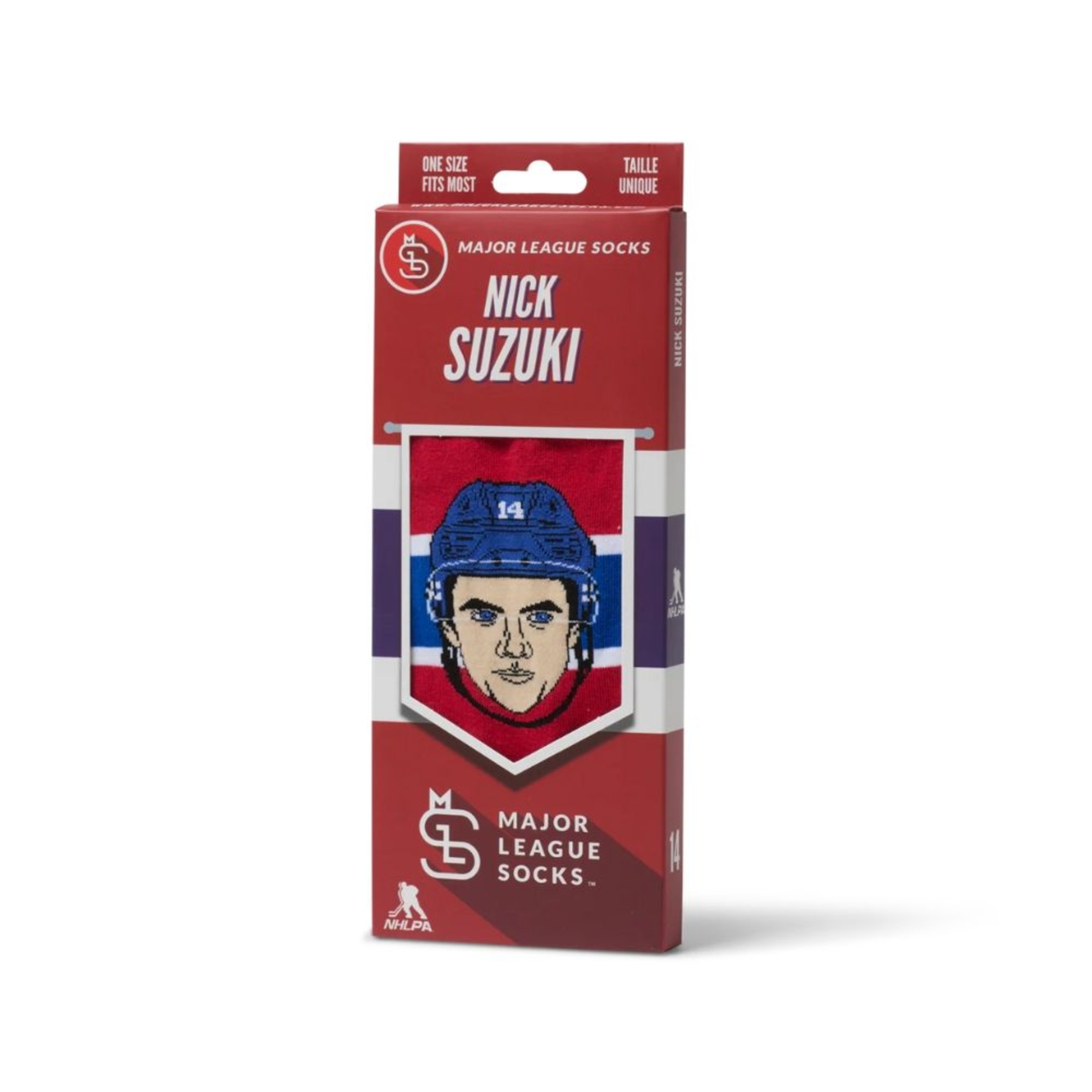 Celebrate your love for the Montreal Canadiens with the Montreal Canadiens Nick Suzuki Major League Socks. These red crew socks feature a vibrant caricature of Nick Suzuki, making them a standout addition to any fan's collection. Perfect for both comfort and style, these cotton socks are a must-have for any hockey enthusiast.
