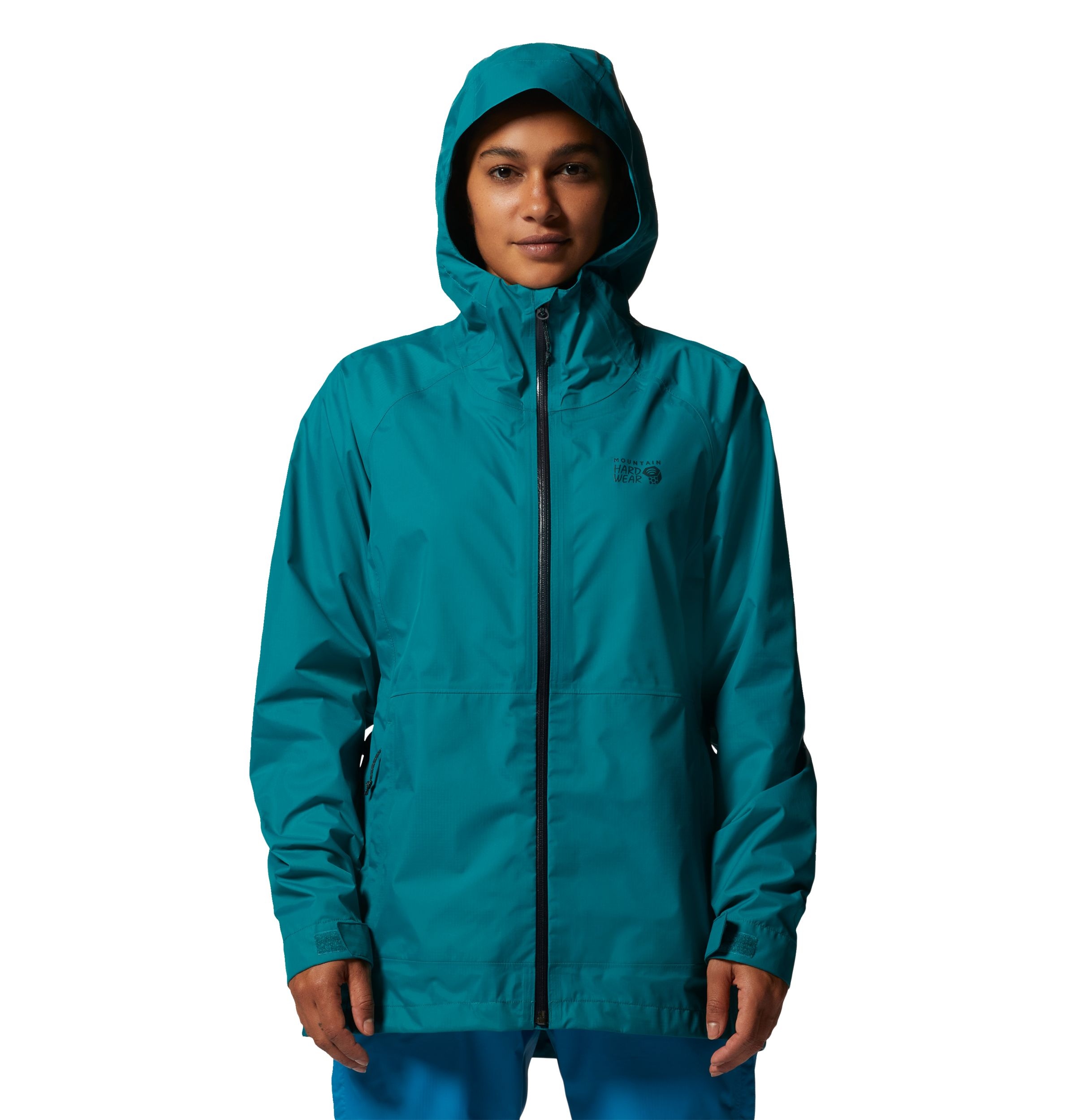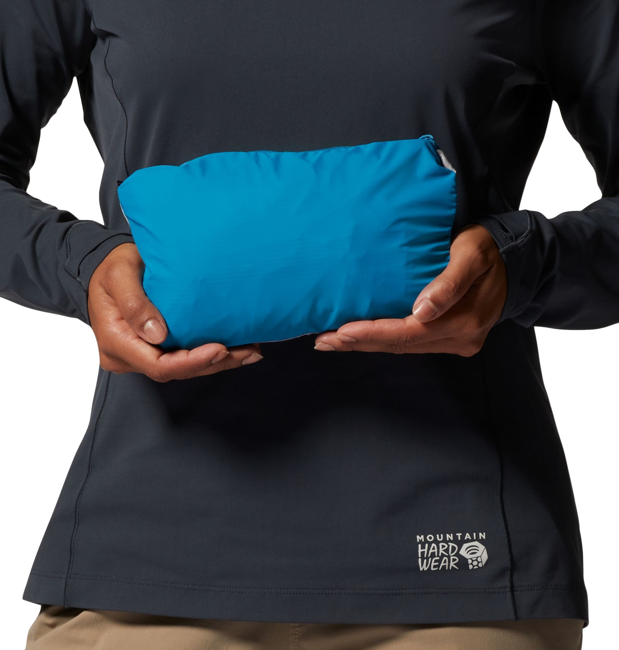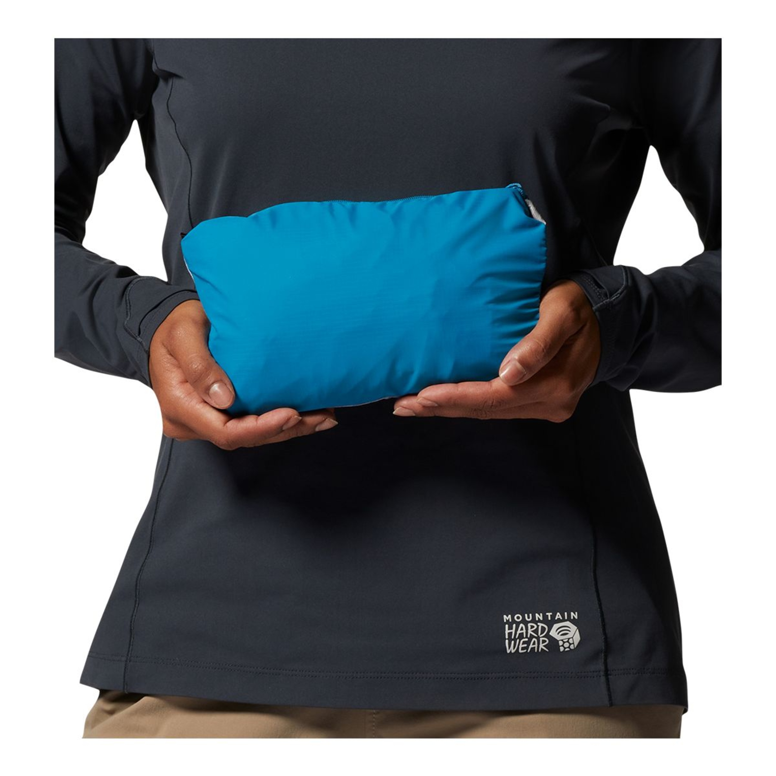 The Mountain Hardwear Women's Threshold Jacket feature underarm zip vents and a highly packable design that fits into its own pocket with a carabiner clip loop. This Mountain Hardwear jacket’s water-resistant zip, adjustable hood, hook-and-loop cuffs and dual drawcord hem ensure versatility and protection in varying weather conditions.