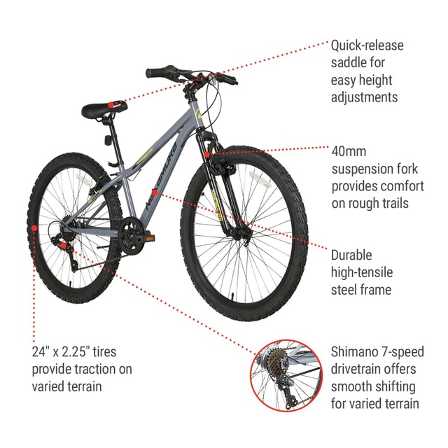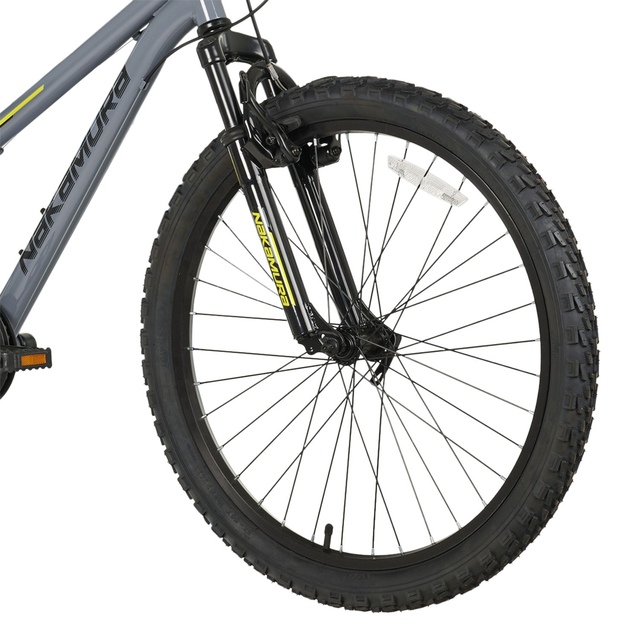 Please add it to your Wishlist for a notification when it’s back.The Nakamura Immersion 24" Junior Mountain Bike is built for young explorers. Its durable high-tensile steel frame and modern geometry ensure excellent handling. Featuring a 40mm suspension fork for a smooth ride, a 7-speed Shimano drivetrain, V-brakes for reliable stopping, and a quick-release saddle, this bike delivers comfort and performance on every adventure.