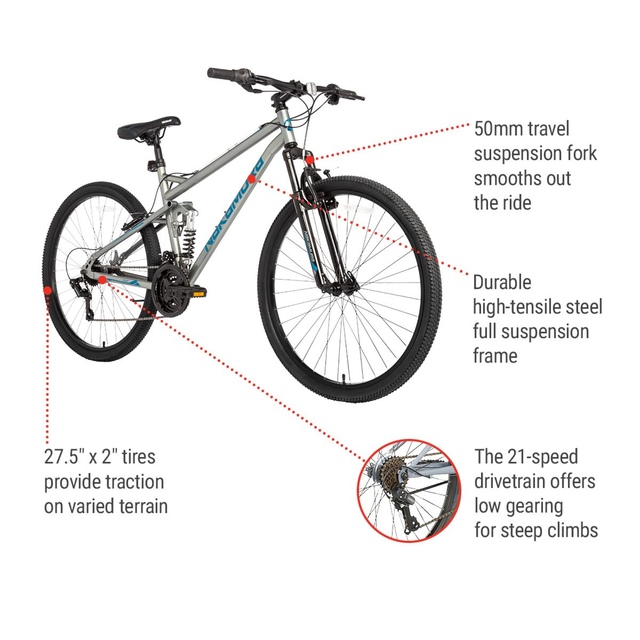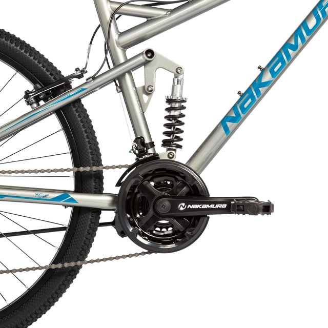 The Nakamura Monster 27.5 Inch Mountain Bike is an excellent recreational full suspension mountain bike. Quality components and 21 speed drivetrain provide the rider with a versatile bike that is great for riding around the neighborhood while also performing well on recreational trails.