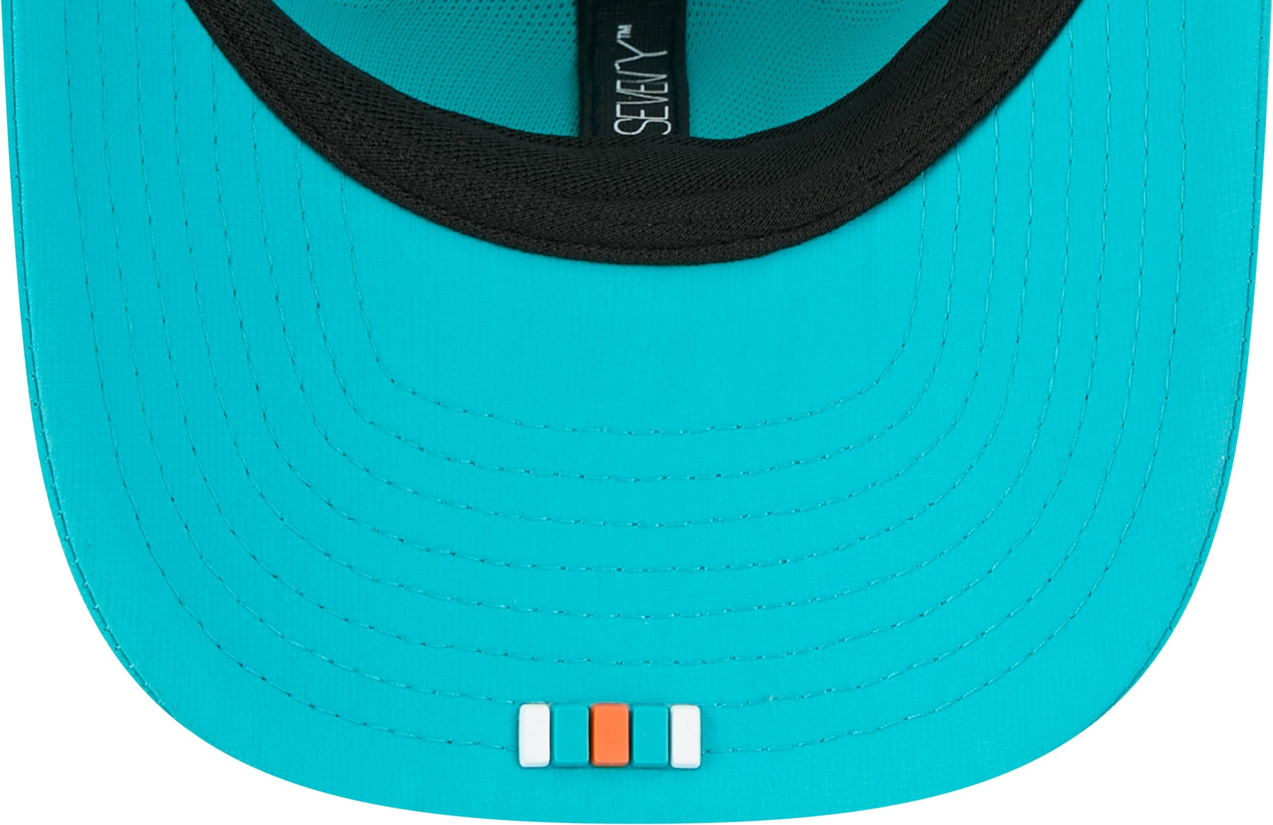 Show your support for the Miami Dolphins with the Miami Dolphins New Era 9SEVENTY Sideline Cap. It features a sewn-down silicone logo patch and a water-repellent design, making it suitable for any weather. The quick-dry cushioned sweatband ensures comfort, while the mesh rear provides breathability.