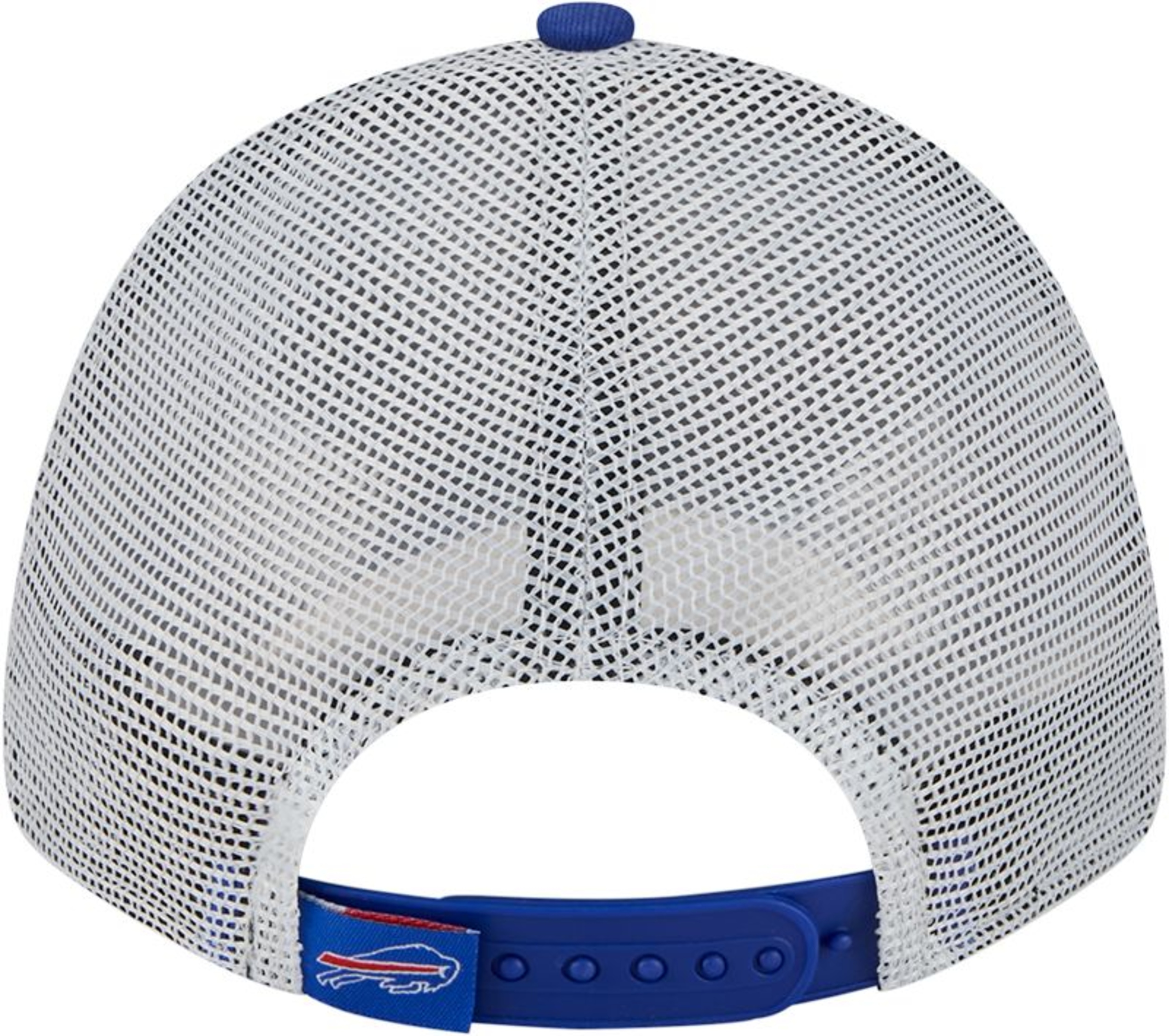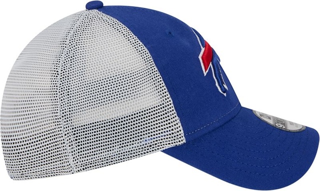 Show your support for the Buffalo Bills with the Youth Buffalo Bills New Era 9FORTY Trucker Cap. It features a royal cotton front and visor, complemented by white mesh panels for a classic trucker look. The embroidered Bills logo on the front and the woven patch on the back add a touch of team pride.