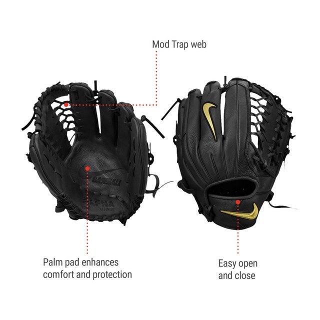 No break in needed - jump right into the game with the Nike® Alpha Huarache Edge baseball fielder's glove. Split grain leather palm, laces and shell provide easy open and close. A synthetic sheepskin on the strap and palm pad enhance comfort and protection.