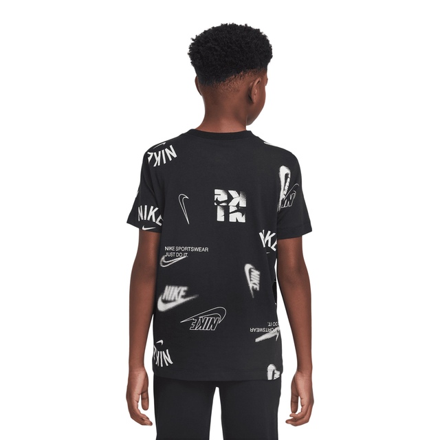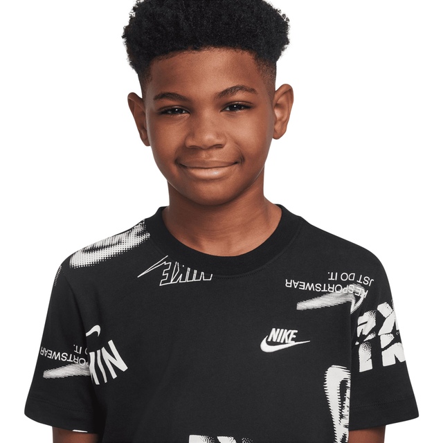 The Nike Boys' Club All-over Print T-Shirt offers the perfect blend of style and comfort. Made from soft cotton with Dri-FIT technology, it wicks away sweat to keep him cool and dry. Designed with a classic fit for a full range of motion, it features an all-over print that adds energy to his look.