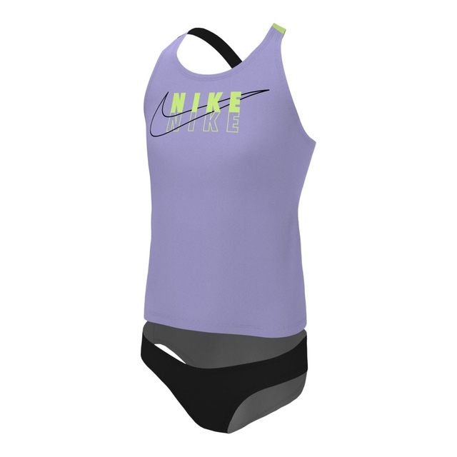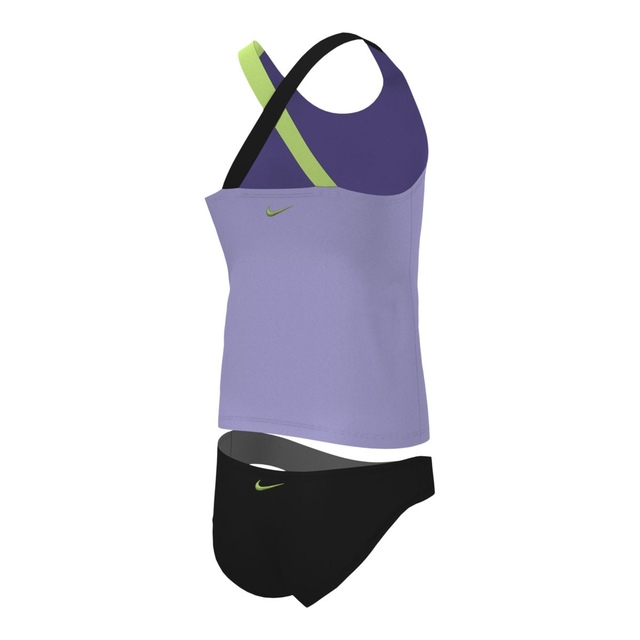 Whether you're doing practice laps to boost your speed or heading to a pool party, this versatile girls' tankini swimsuit offers just the right mix of performance and style. The two piece girls' swimsuit is designed with an ergonomic enhanced fit perfect for young athletes. A Nike Reflect logo and contrast-colored straps add modern flair to the top. Horseback design allows you to practice both your front crawl and backstroke without feeling constricted. Soft and stretchy tricot fabric provides impressive comfort, while standard bottom coverage makes this tankini swimsuit a smart choice for all your favorite water activities.