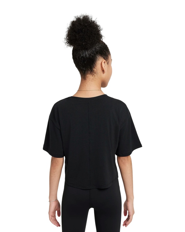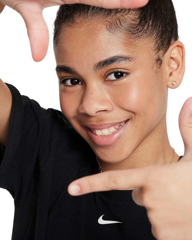 The Nike Girls' Dri-FIT One Loose T Shirt offers relaxed comfort and exceptional moisture management. Made with Nike's signature Dri-FIT technology, this lightweight jersey tee wicks sweat away from the skin to keep you dry and comfortable during practice or casual wear. The loose, roomy fit combines with underarm fabric panels to allow unrestricted movement and coverage. A slightly curved hem enhances the relaxed look while ensuring it stays in place as you move.