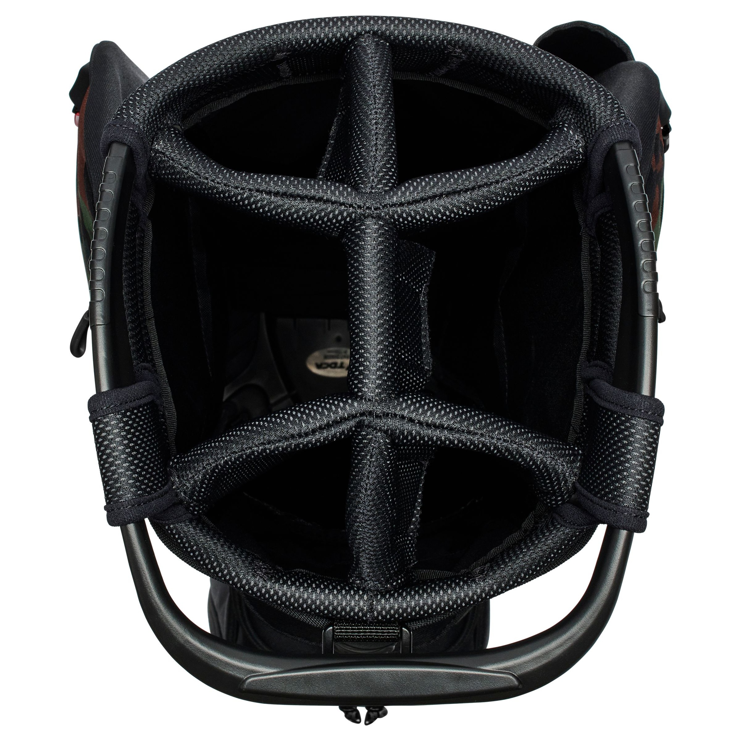The Nike Air Hybrid 2 Golf Bag features detachable max air straps for versatile comfort and use. Constructed with a 14-way, full-length divider system, which helps keep clubs organized. Features an insulated pocket that keeps food and beverages cold. Made with a water-resistant rain hood that protects clubs from the elements. Has utility webbing, which conveniently holds your accessories. Contents: Body: 100% Polyester; Lining: 100% Polyester.