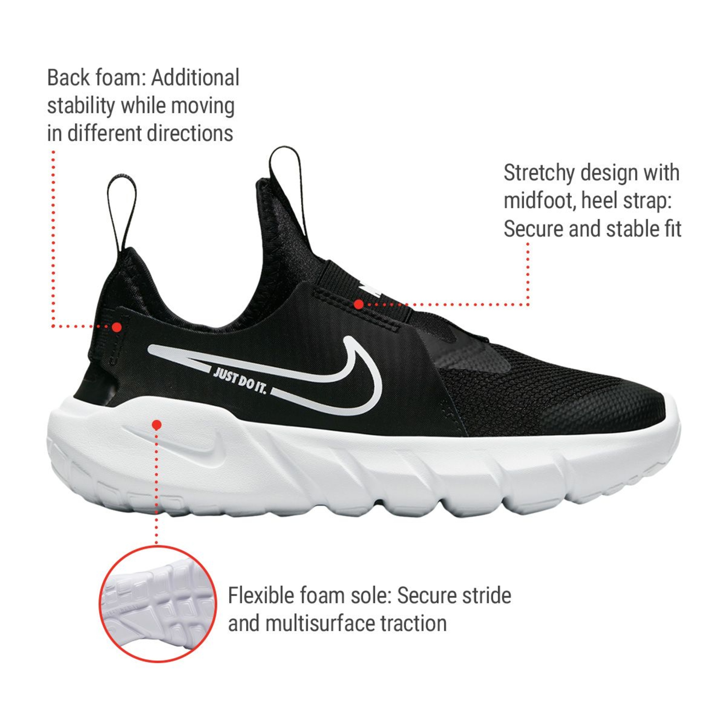 Who’s ready to play? The Nike Flex Runner 2 is built for the kiddo on the go—from the playground to wherever their day takes them. It’s laces-free! Meaning it’s super quick to slip on and off. The straps and bootie-like design make sure your little one’s fit stays snug while they run and jump.
