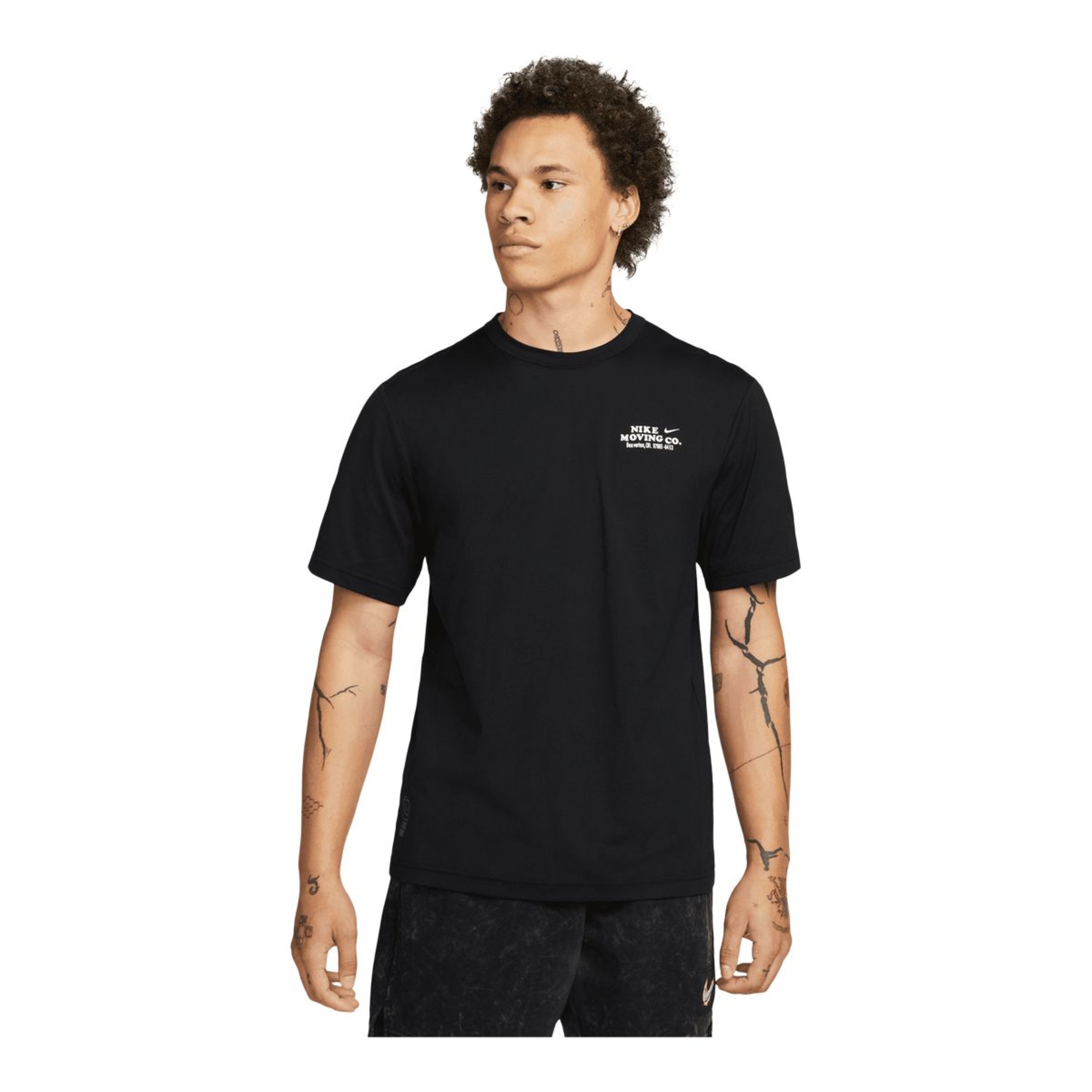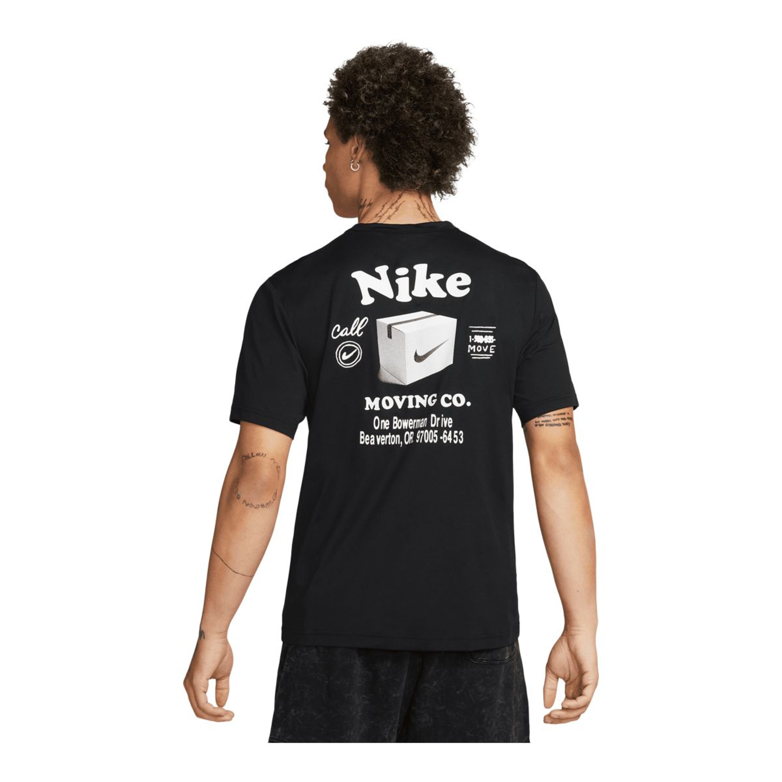 It has a soft feel and UV protection so you can get through your hardest workouts in comfort. Graphics on the chest and back advertise the Nike Moving Co., which has got people out of their houses for over 50 years.