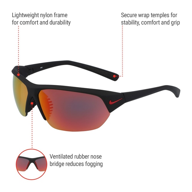 You may be interested in these similar products shown below.The Nike Skylon Ace is ultra-light, provides ample coverage and is perfect for training, baseball, golf, running, tennis, cycling, and more. Constructed with a lightweight nylon frame for comfort and durability, this style features a ventilated rubber nose bridge that reduces fogging. Made with durable, high-tension hinges, and has secure wrap temples for stability, comfort, and added grip.