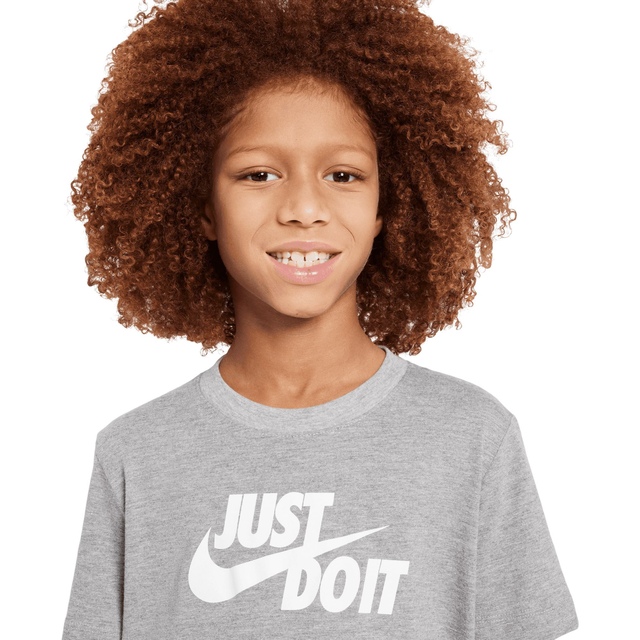 The Nike Sportswear Boys' Just Do It T Shirt blends soft cotton fabric with a relaxed, classic fit for all-day comfort. Featuring the iconic 'Just Do It' logo, this casual tee offers breathable comfort and sporty style, perfect for everyday wear.