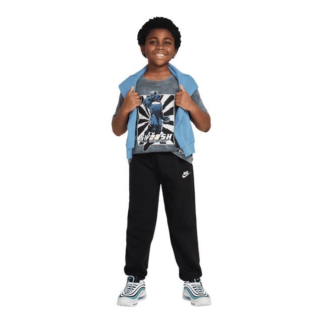 The Nike Sportswear Kids' Hero Graphic T-Shirt combines classic style with casual comfort. Made from soft, breathable cotton, this relaxed-fit tee offers unrestricted movement for active kids. A bold graphic print adds a playful touch to this versatile kids' top.