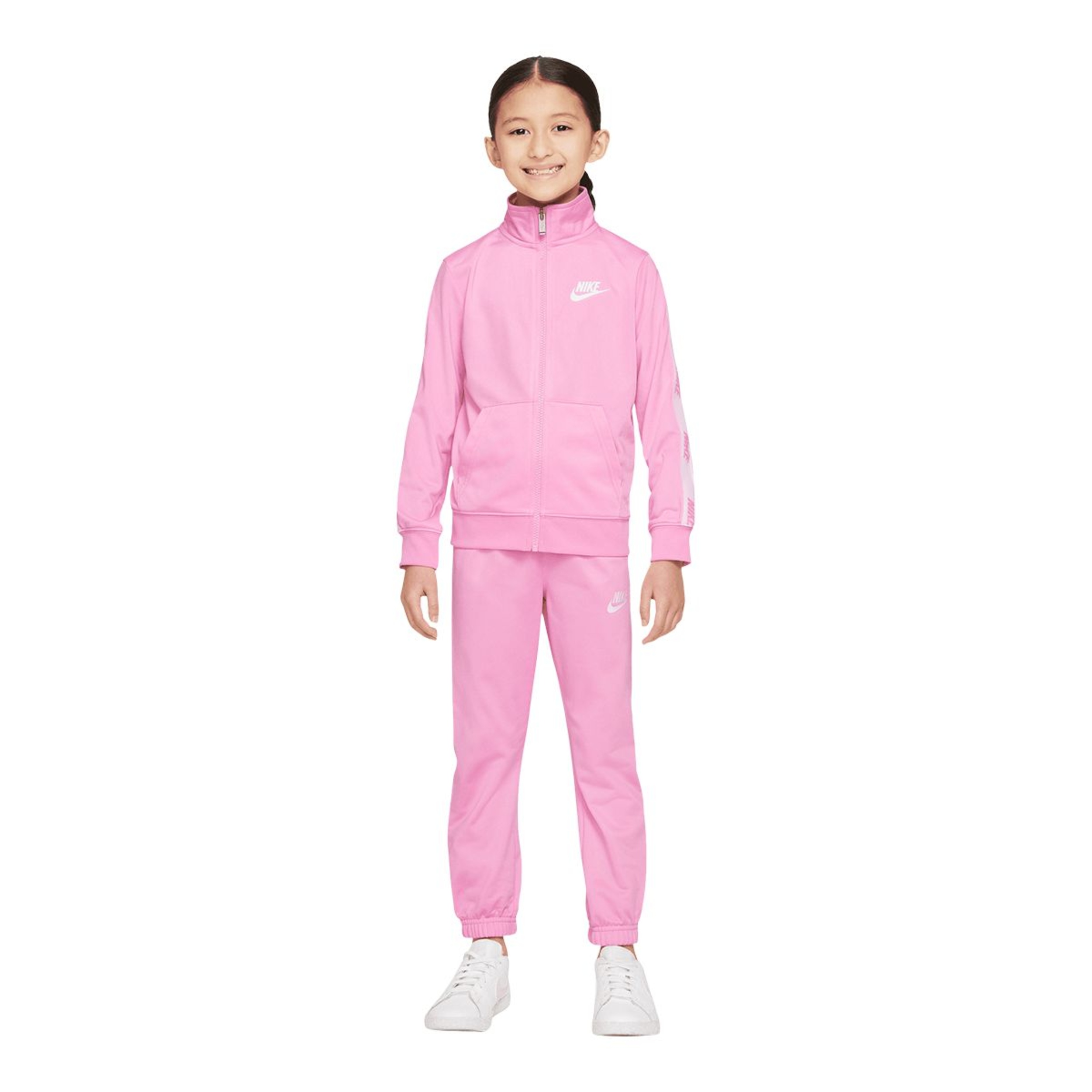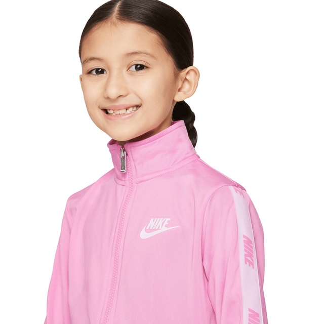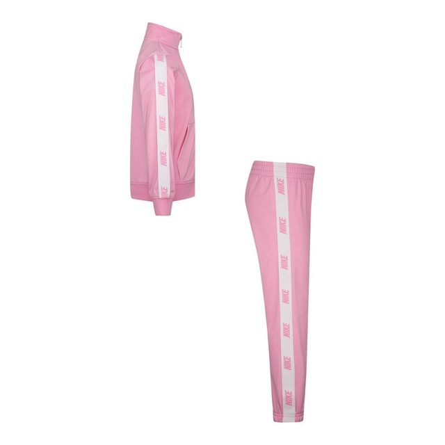 Inspired by the classic tracksuit, this Nike Sportswear Toddler Kids' Logo Track Suit Set is made of brushed back poly tricot fabric and includes a full-zip jacket with a mock neck and kangaroo pocket. The pants have a comfy stretch waistband, side seam pockets and tapered legs with ribbed cuffs for comfort.