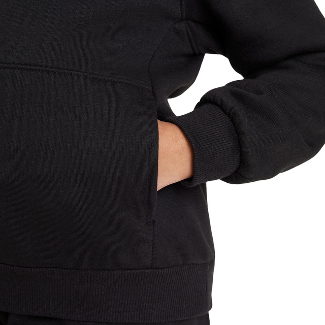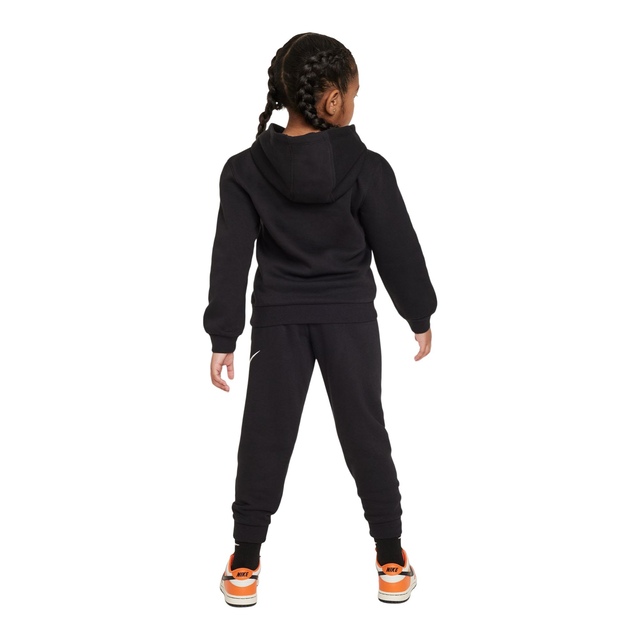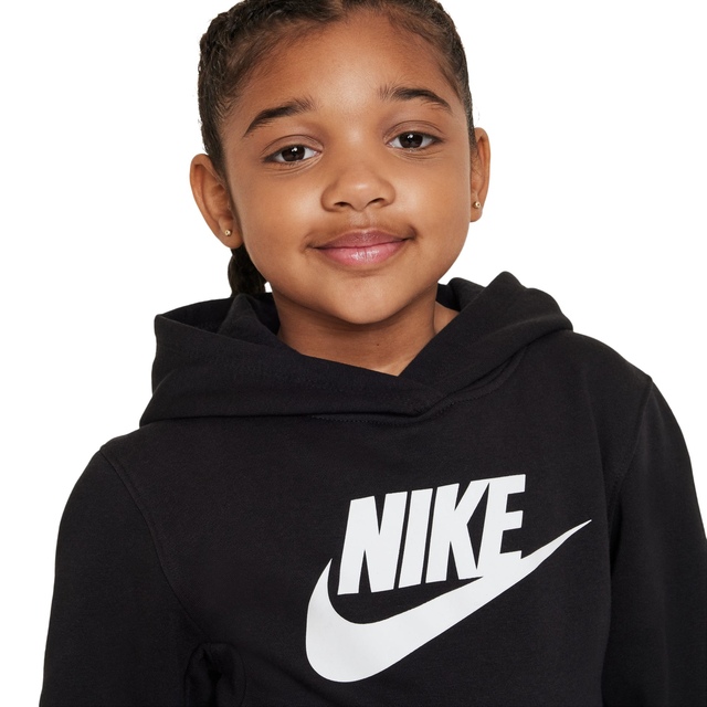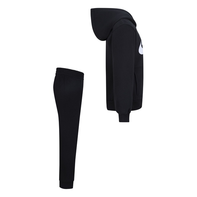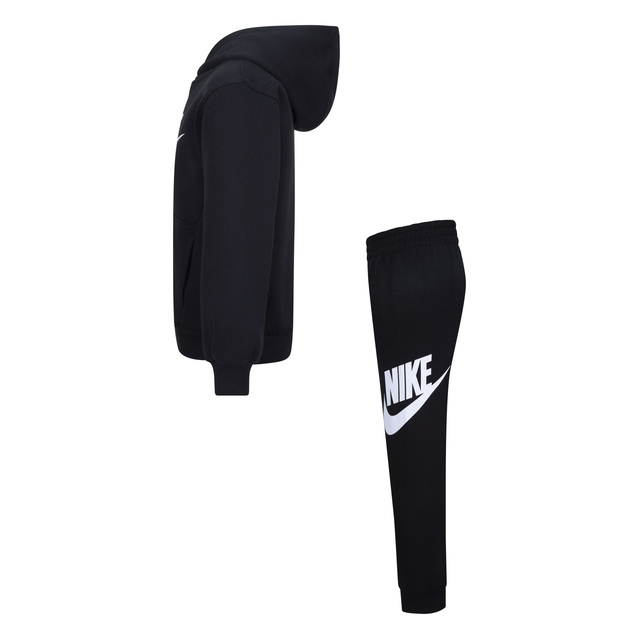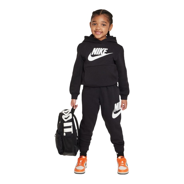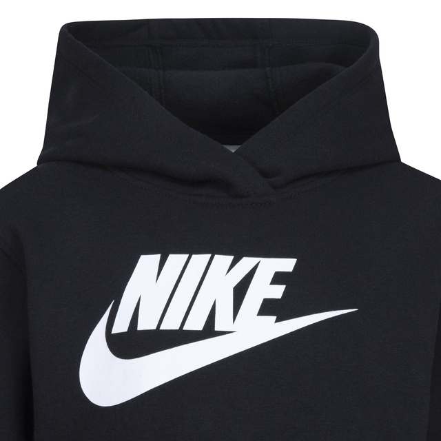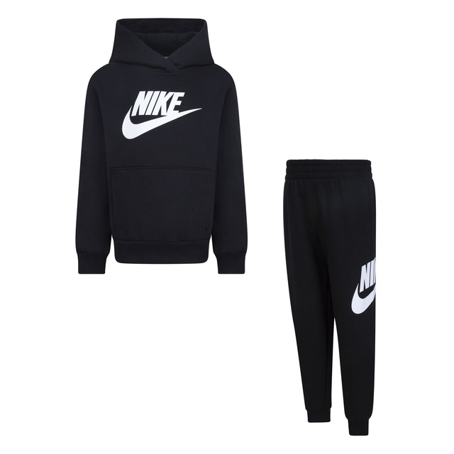 Soft and stretchy fleece sweatshirt with a standard hood, kangaroo pocket and ribbed waistband and cuffs. Paired with cozy fleece pants with elastic waistband and cuffs for everyday comfort. Finished with matching Nike Futura logos.