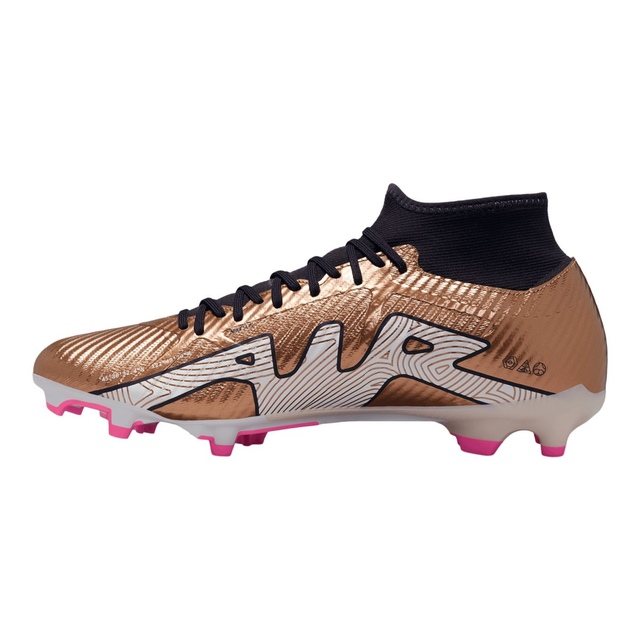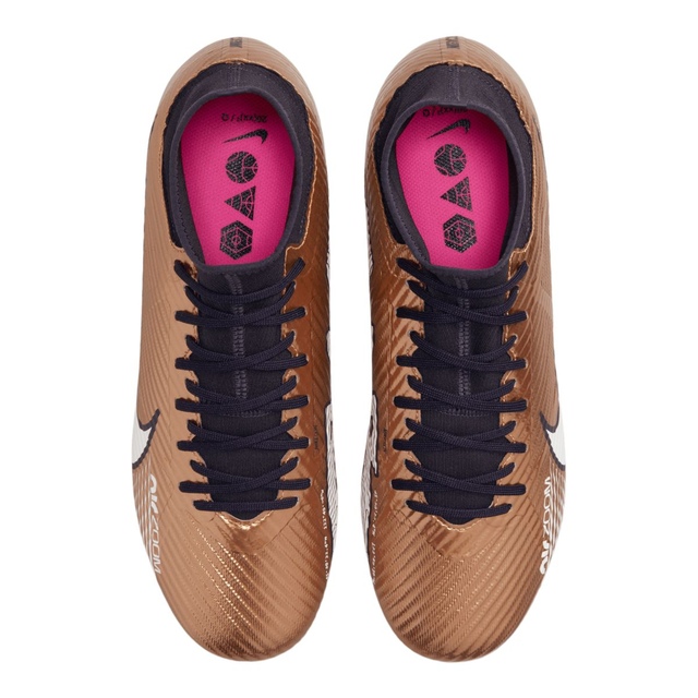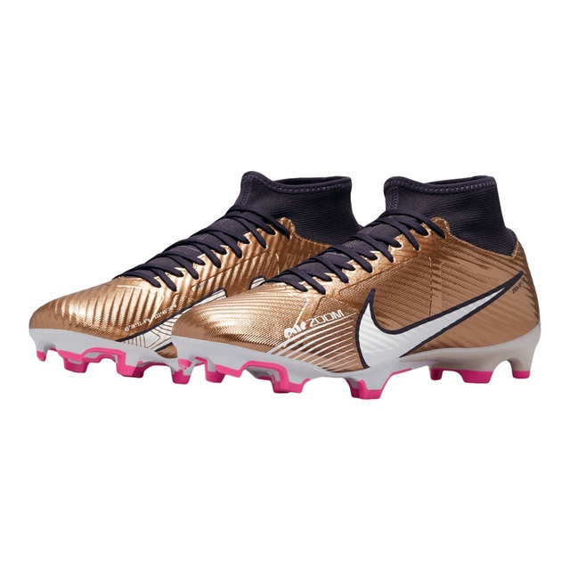 Instantly tilt the field in the bold design of the Nike Unisex Mercurial Zoom Superfly 9 Academy Multi-Ground Mesh Soccer Cleats. Loaded with a Zoom Air unit in the foreplate and a flexible NikeSkin up top, these multi-ground cleats offer speed and control. The contoured toe box and heel lockdown provide a secure fit, while the cushioned insole delivers comfort. These soccer cleats are ideal for use on both natural and synthetic surfaces.