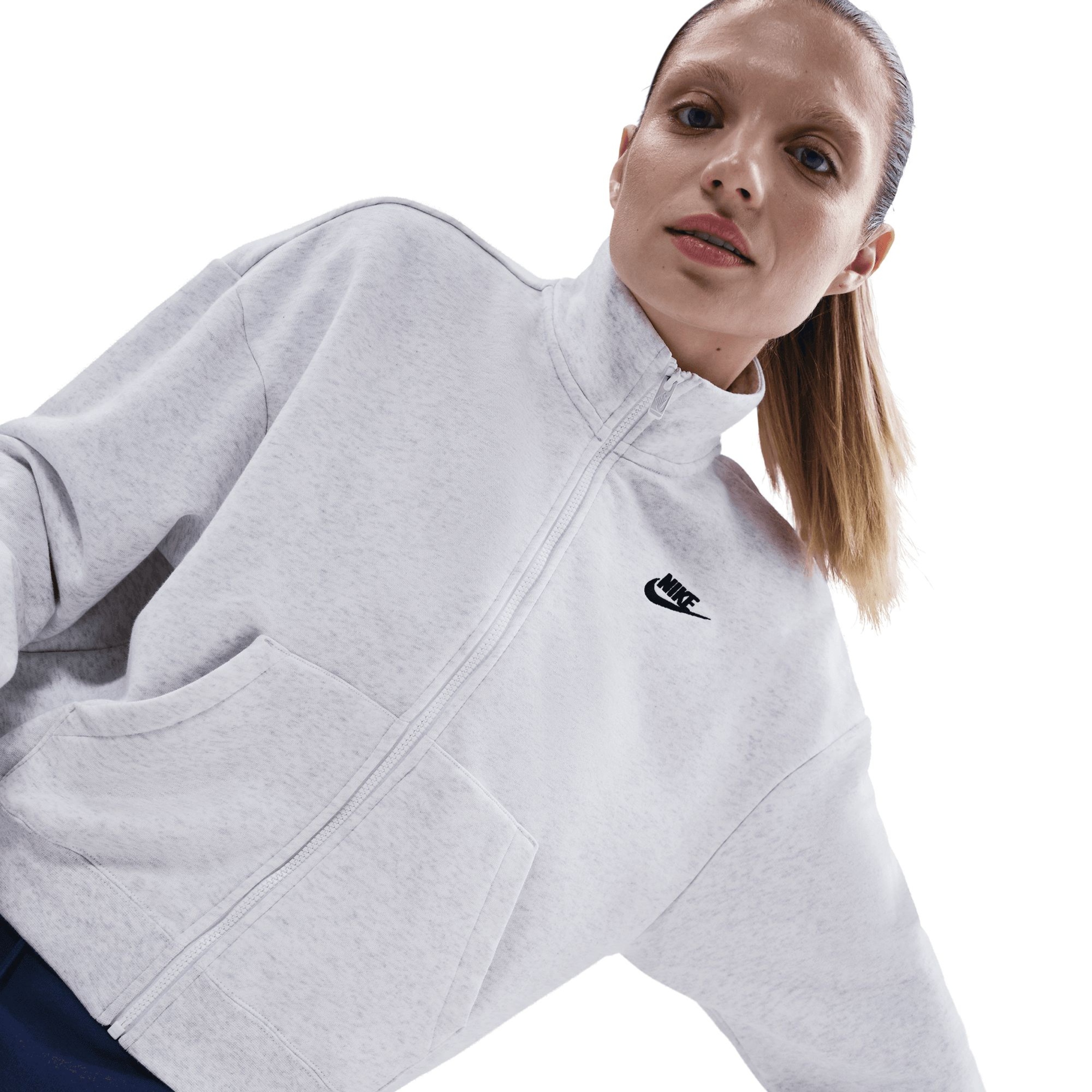 Stay comfortable and stylish with the Nike Women's Club Fleece Loose Track Jacket. Crafted from midweight, semi-brushed fleece, this women's jacket offers a smooth exterior and a cozy interior. Its relaxed fit provides a structured yet casual appearance, perfect for any athleisure activity.